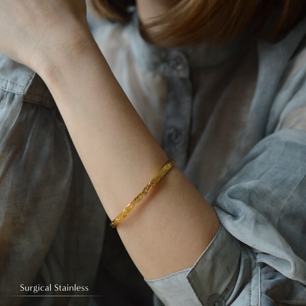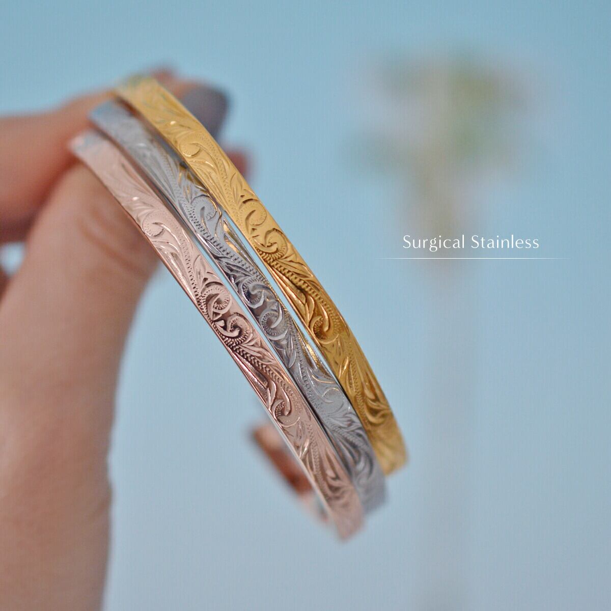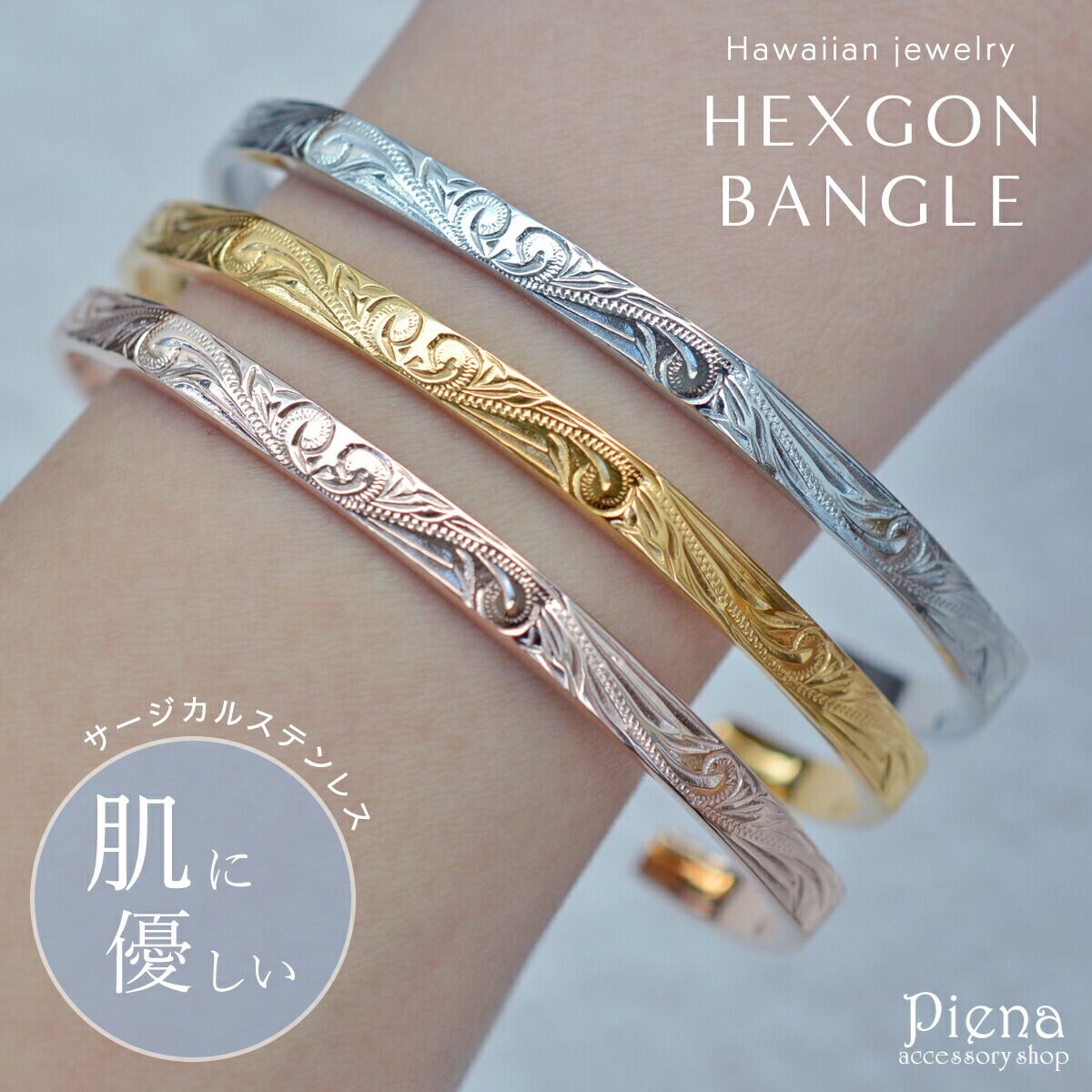ハワイアンジュエリー 六角形 オープン バングル レディース メンズ サージカルステンレス316L シルバー ゴールド ピンクゴールド 幅4mm ユニセックス ペア 金属アレルギー対応 ヘキサゴン スクロール 波 海 細め ハワジュ ギフト プレゼント