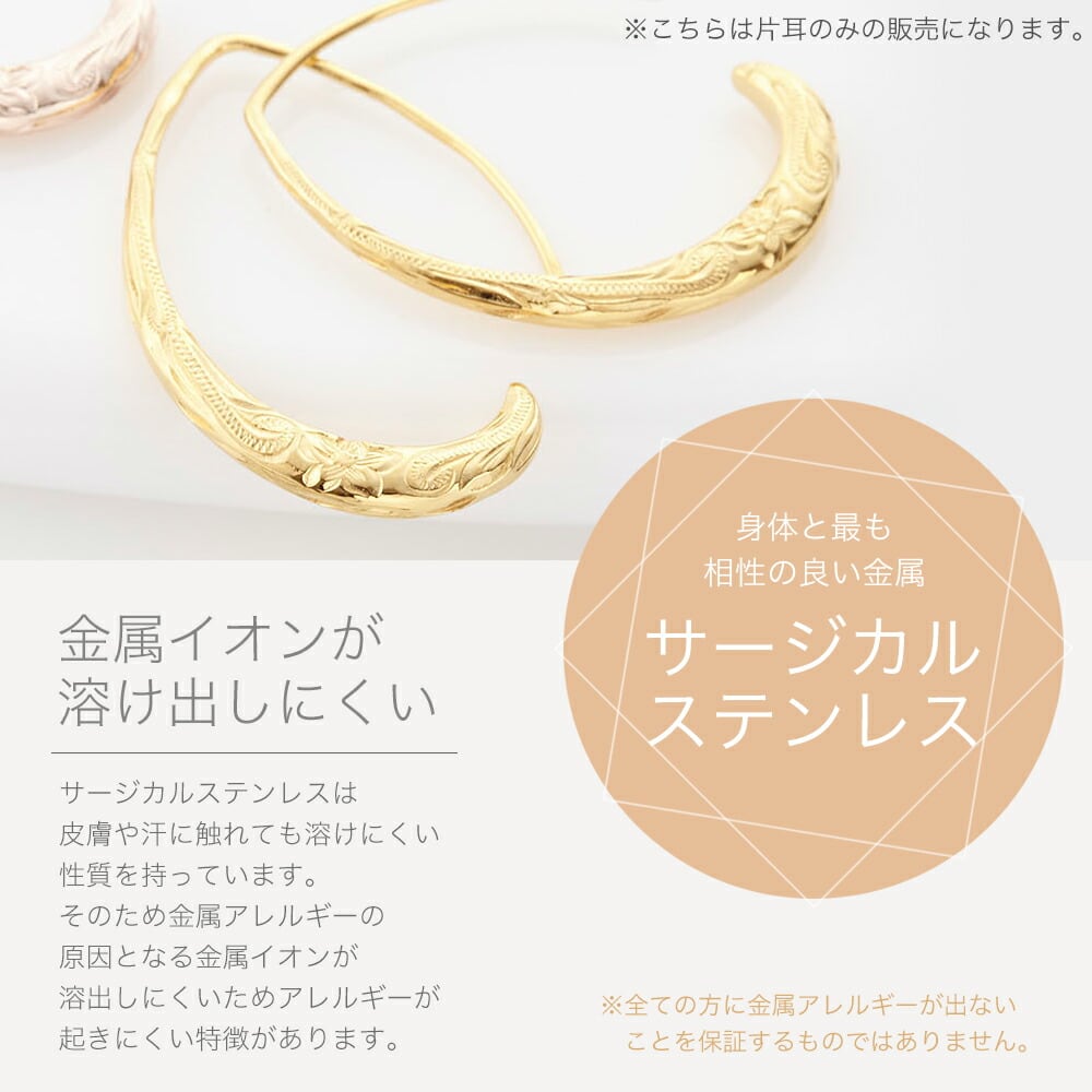 片耳用ハワイアンジュエリーフックピアス つけっぱなし プランプピアス つけっぱなし オーバル フープ 1個売り レディース サージカルステンレス 金属アレルギー対応 シルバー ゴールド ピンクゴールド プルメリア 波 トレンド シンプル 彫刻 誕生日 プレゼント ギフト