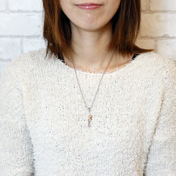 量感のあるロングチャームと、艶感ステンレスシルバーカラーの陰影あるシルエットが煌き、1粒ストーンがさりげないポイントに。