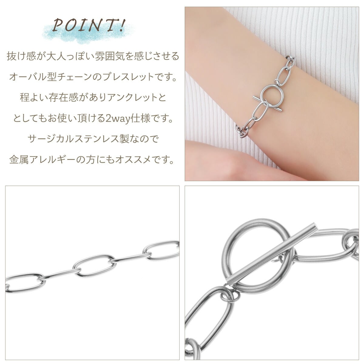 ブレスレット アンクレット レディース サージカルステンレス チェーン マンテル 抜け感 お肌に優しい 金属アレルギー対応 オシャレ 誕生日 記念日 プレゼント ギフト メール便送料無料