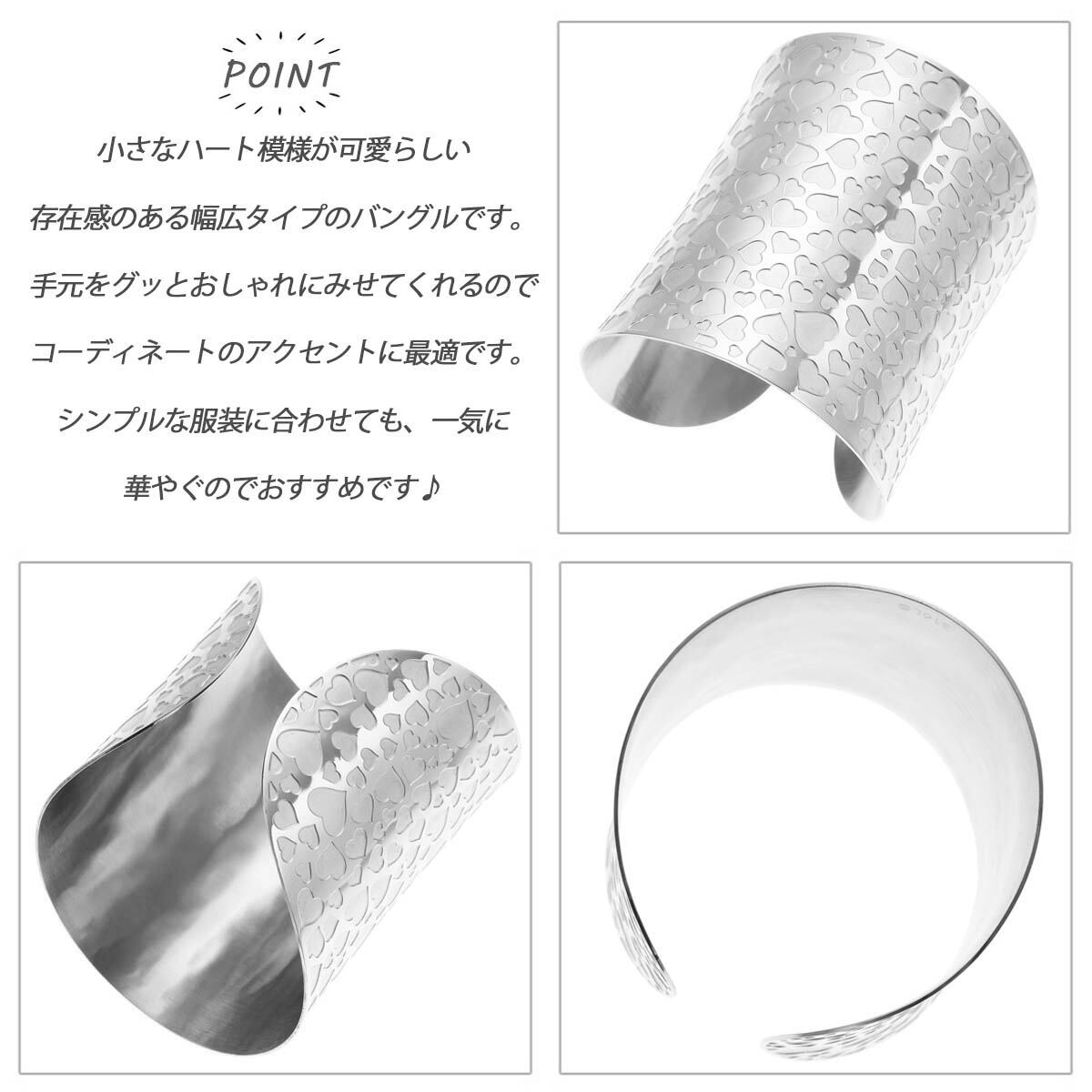 バングル レディース サージカルステンレス316L製 幅広 ハート お肌に優しい 金属アレルギー対応 フェミニン ガーリー 華やか 華奢 シンプル 上品 可愛い おしゃれ 美しい 綺麗 ラフ カジュアル パーティー 誕生日 記念日 プレゼント ギフト 贈り物 メール便送料無料