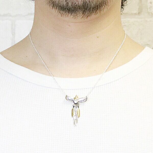 翼を広げたイーグルに3枚のフェザーをフリンジさせたデザインのネックレス。