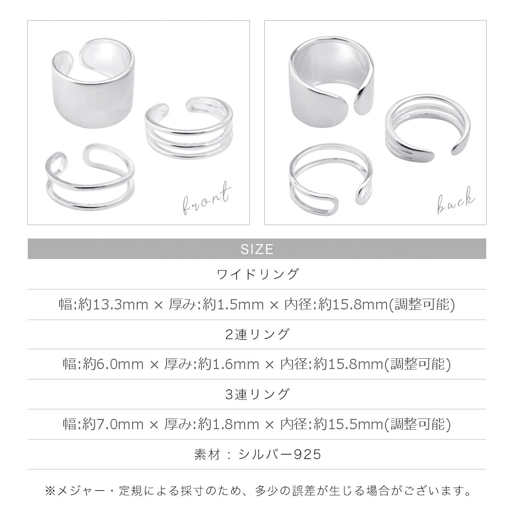 ボリュームのあるワイドリングに重ね付けしたような華奢な連リング。この3点だけでバランスの良い指元が完成。調整可能なフリーサイズのため、その日の気分や服装に合わせて様々な指に付け替えて楽しむことが出来ます。