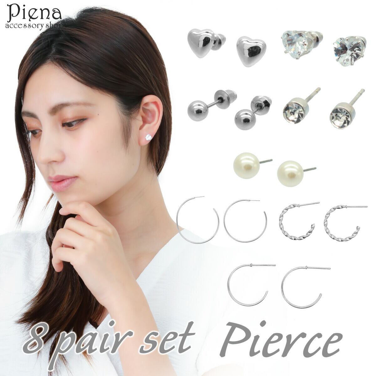 シンプルで使いやすい8ペアセットのピアスです。