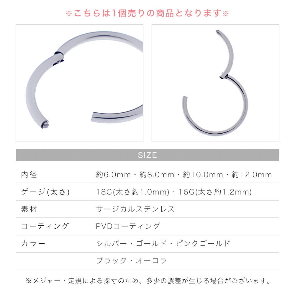 ボディピアス フープ 18G 16G 片耳 1個売り ゲージ ワンタッチ キャッチレス クリッカー セグメントリング つけっぱなし サージカルステンレス PVDコーディング 金属アレルギー対応 低アレルギー シルバー ゴールド ピンク ブラック オーロラ