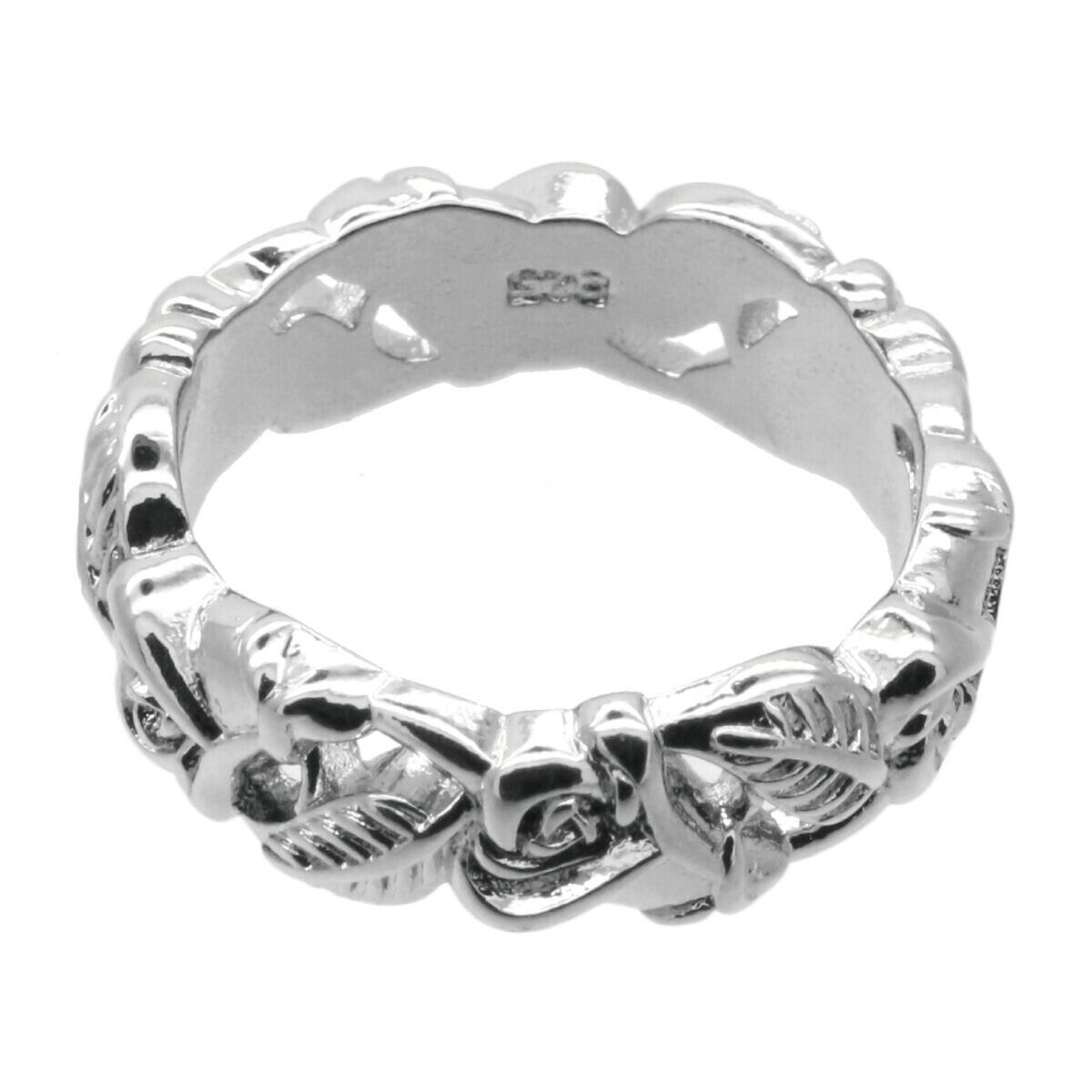 バラと葉が絡み合う透かし加工が美しいリングです。