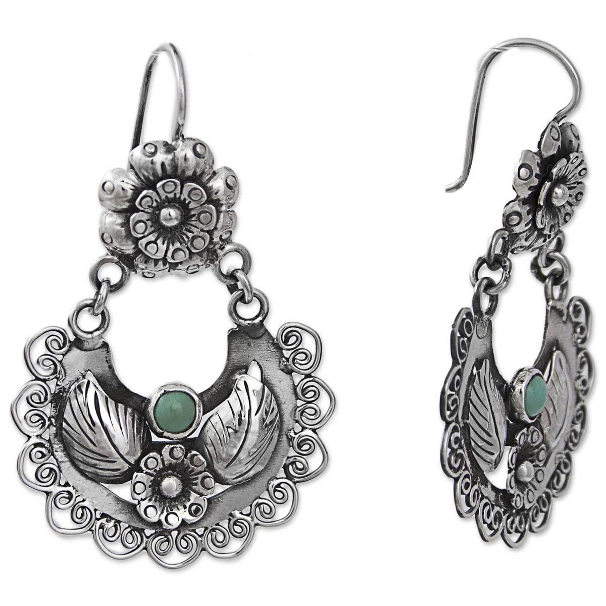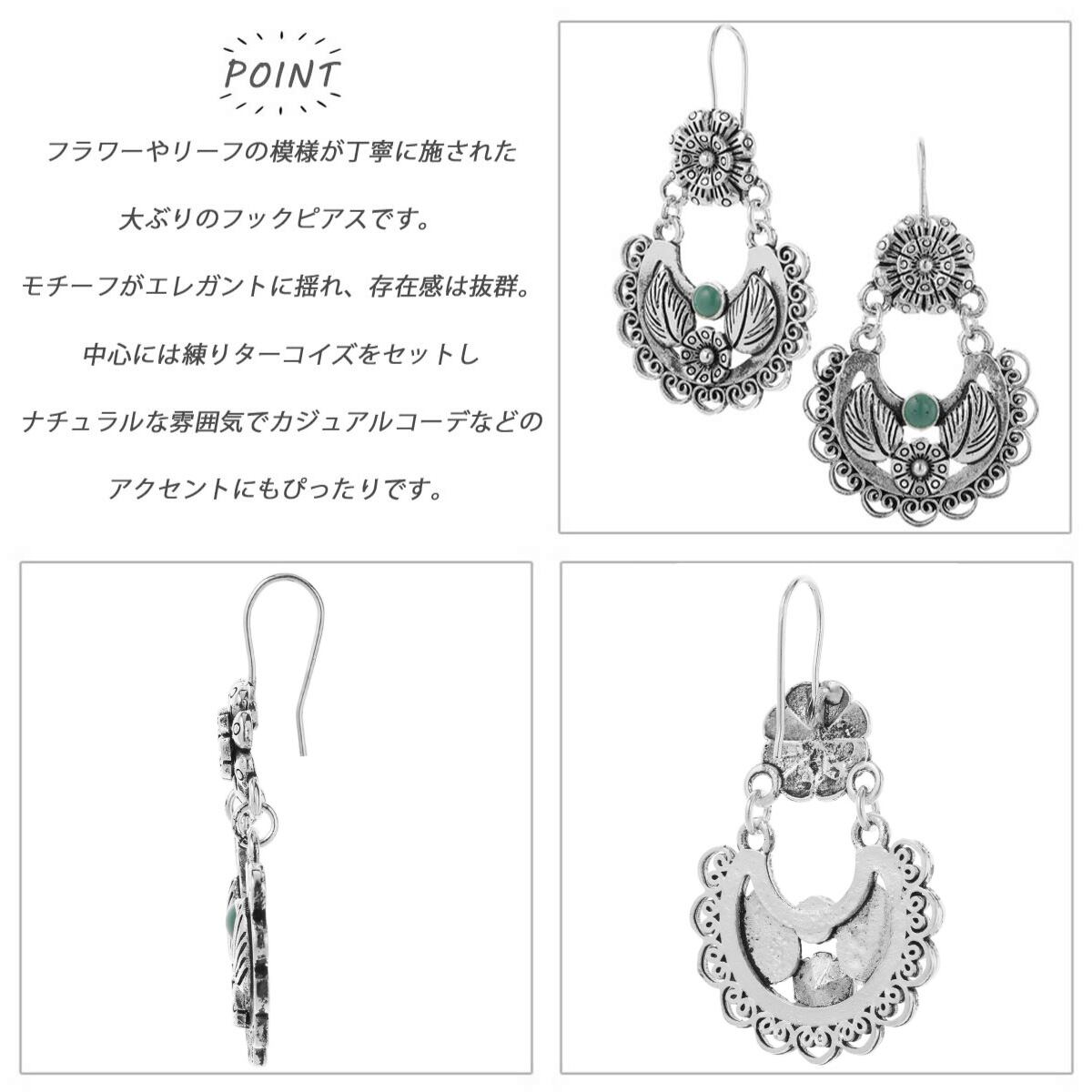 ピアス レディース フック シルバー925コーティング エスニック風 花 葉 大ぶり ネリターコイズ トルコ石 カレンシルバー風仕上げ 華やか シンプル ナチュラル エレガント 可愛い おしゃれ 美しい 綺麗 カジュアル パーティー 誕生日 記念日 プレゼント メール便送料無料