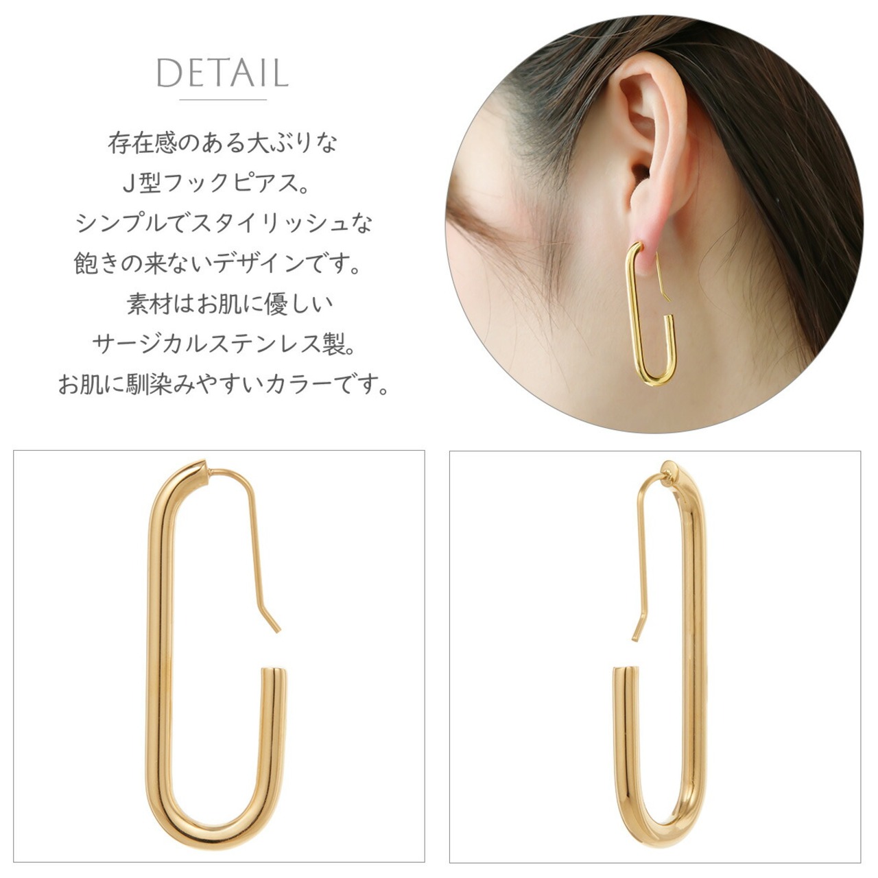 フックピアス つけっぱなし レディース サージカルステンレス製 J字型 楕円 オーバル おしゃれ 上品 大人 シンプル スタイリッシュ 大きめ 大ぶり ゴールド ピンクゴールド お肌に優しい 金属アレルギー対応 プレゼント ギフト メール便送料無料