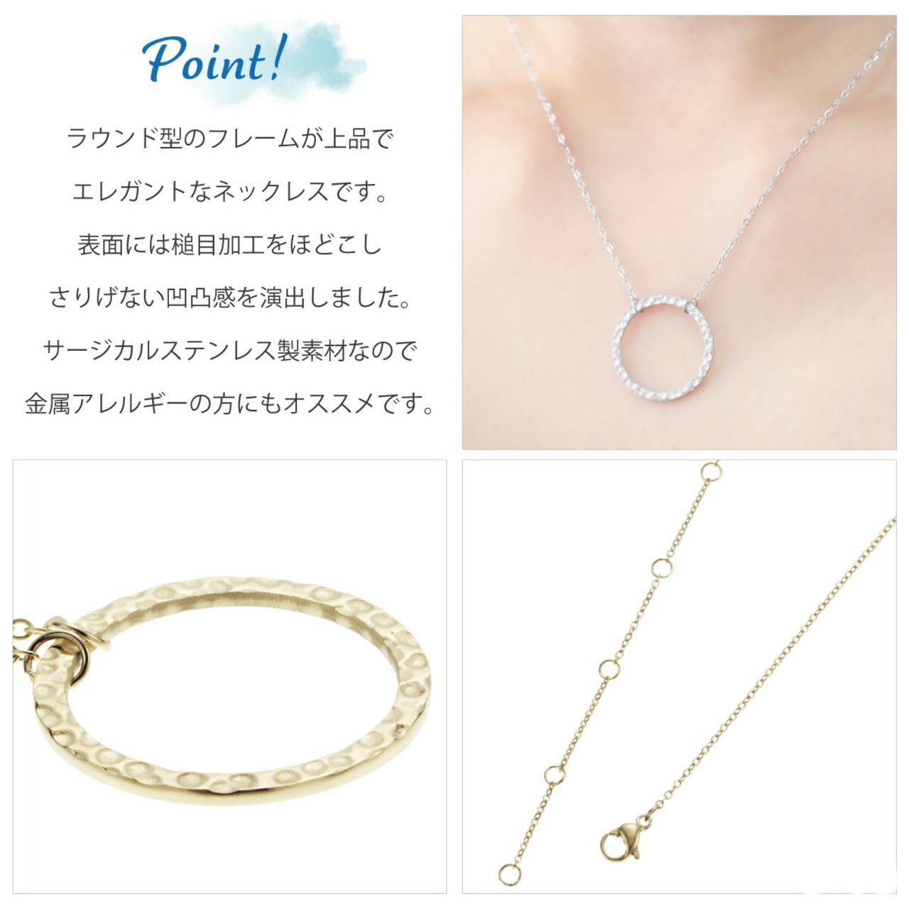 ネックレス ペンダント レディース サージカルステンレス製 サークル ラウンド 華奢 槌目 お肌に優しい 金属アレルギー対応 オシャレ かわいい 大人可愛い パーティー プレゼント ギフト 誕生日 記念日 メール便送料無料