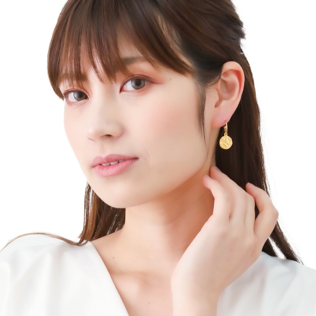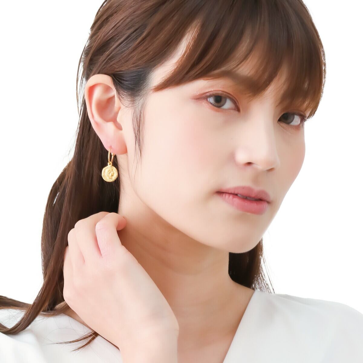 耳元で小さな金貨が揺れる遊び心のあるピアス。