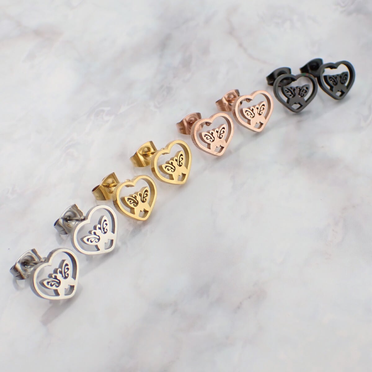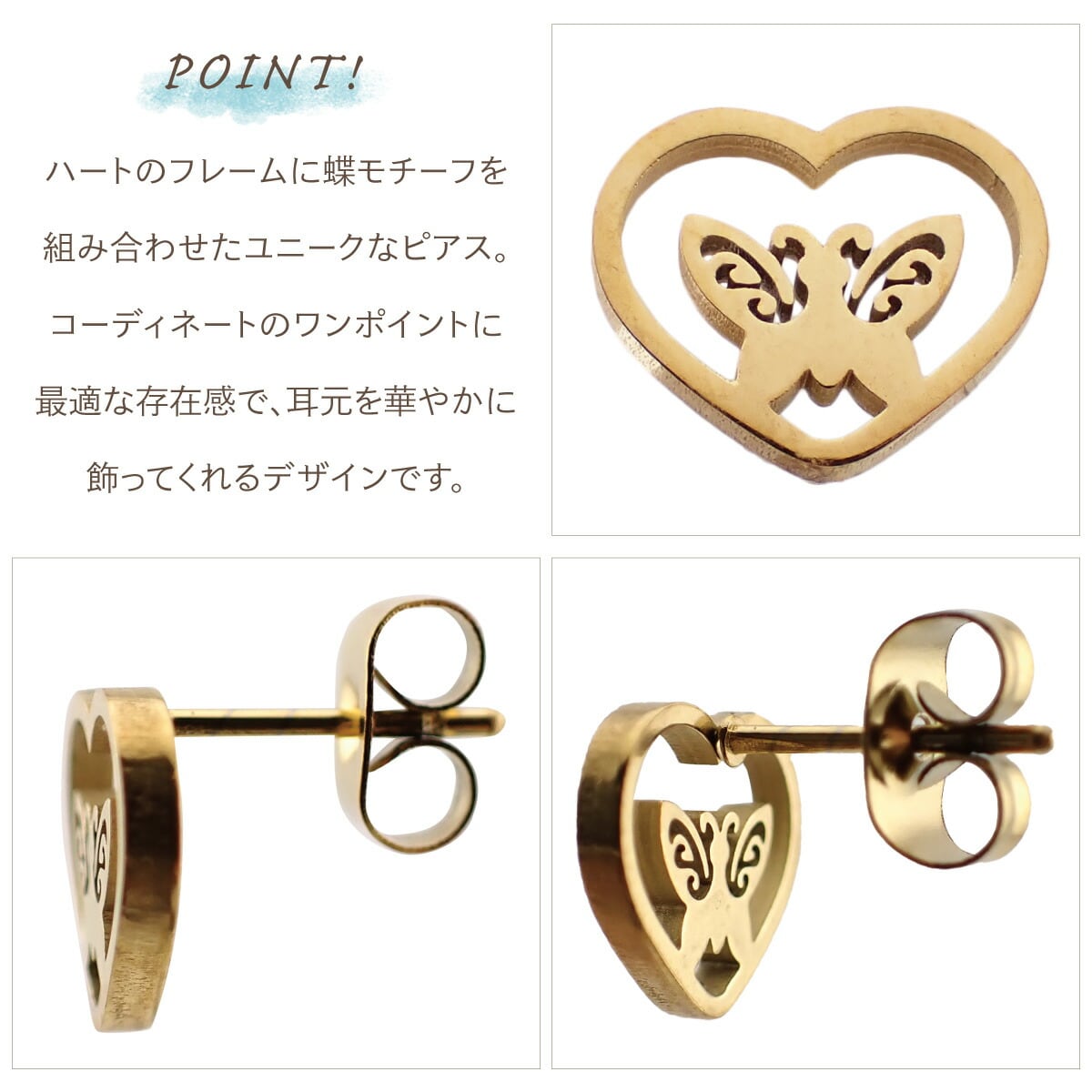 ピアス つけっぱなし レディース サージカルステンレス製 ハート フレーム 蝶 バタフライ ちょうちょ 蝶々 シンプル お肌に優しい 金属アレルギー対応 金アレ 上品 かわいい 大人可愛い 誕生日 記念日 プレゼント ギフト メール便送料無料