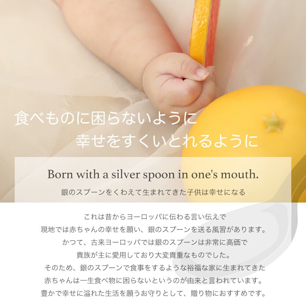 古来よりヨーロッパでは赤ちゃんの幸せを願い、銀のスプーンを送る風習がありました。一生食べ物に困らないように、豊かで幸せに溢れた生活を願うお守りとして出産祝いの贈り物におすすめです。更に生まれた月の誕生石を選ぶことでより特別感が増し、深い想いを届けることが出来ます。