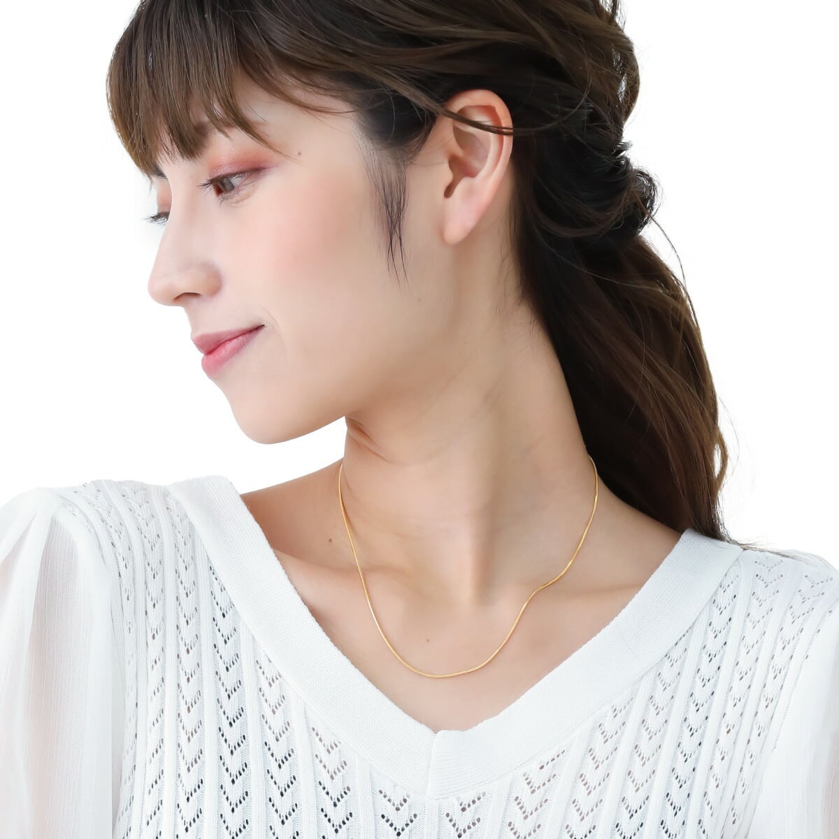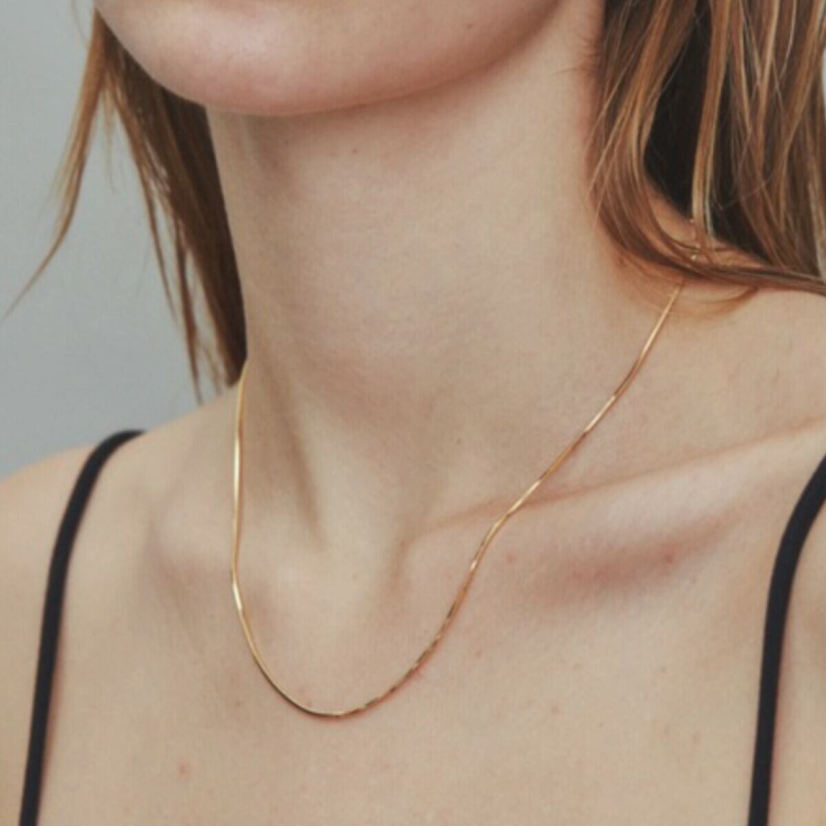 繊細でさりげない存在感を与えるスネークチェーンのネックレス。