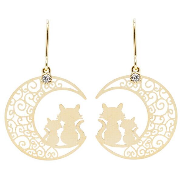三日月に乗った動物たちと寄り添って夜空を見上げているようなネコたちのフックピアスです。