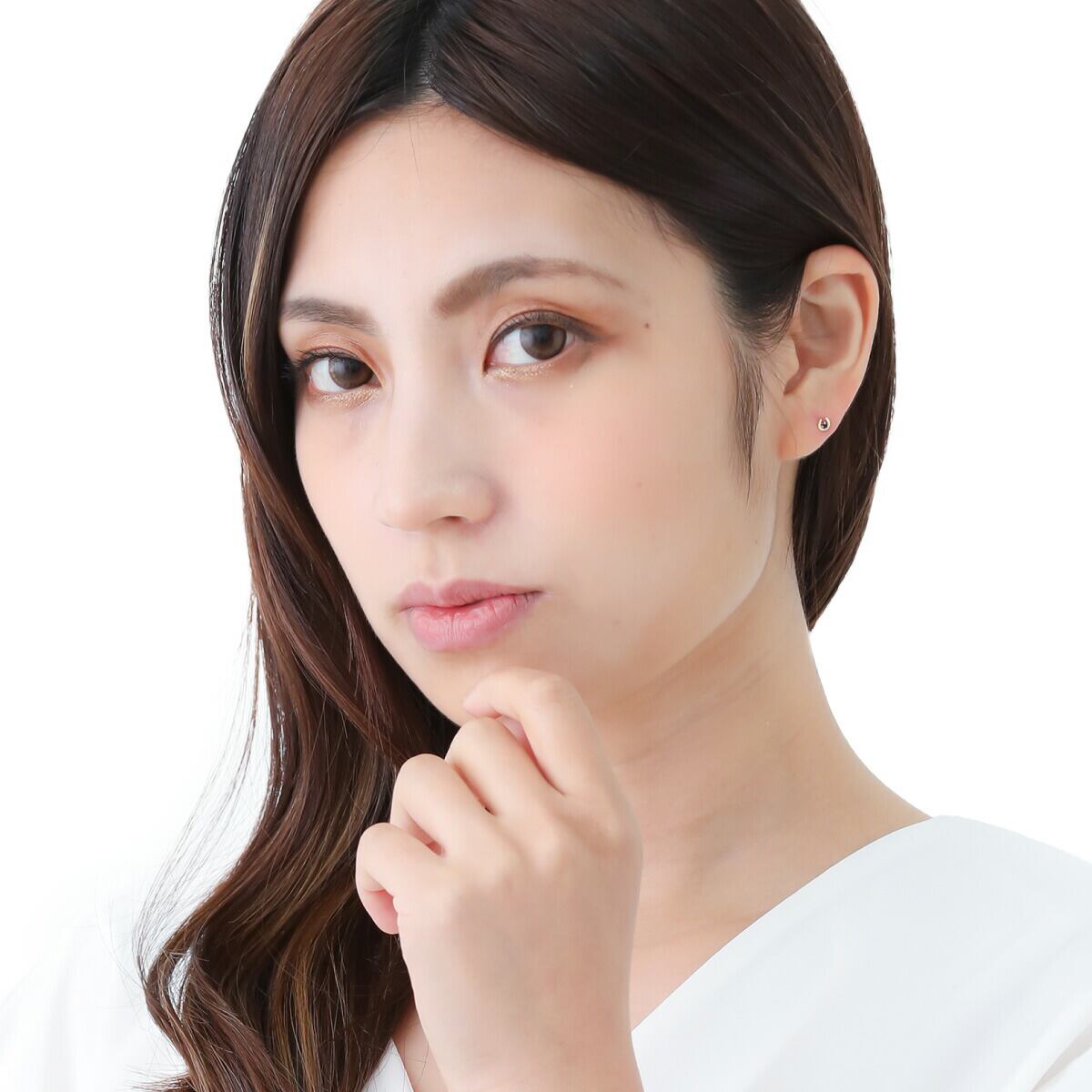 ストーンが耳元でさりげなく輝き、顔まわりを華やかに彩ります。