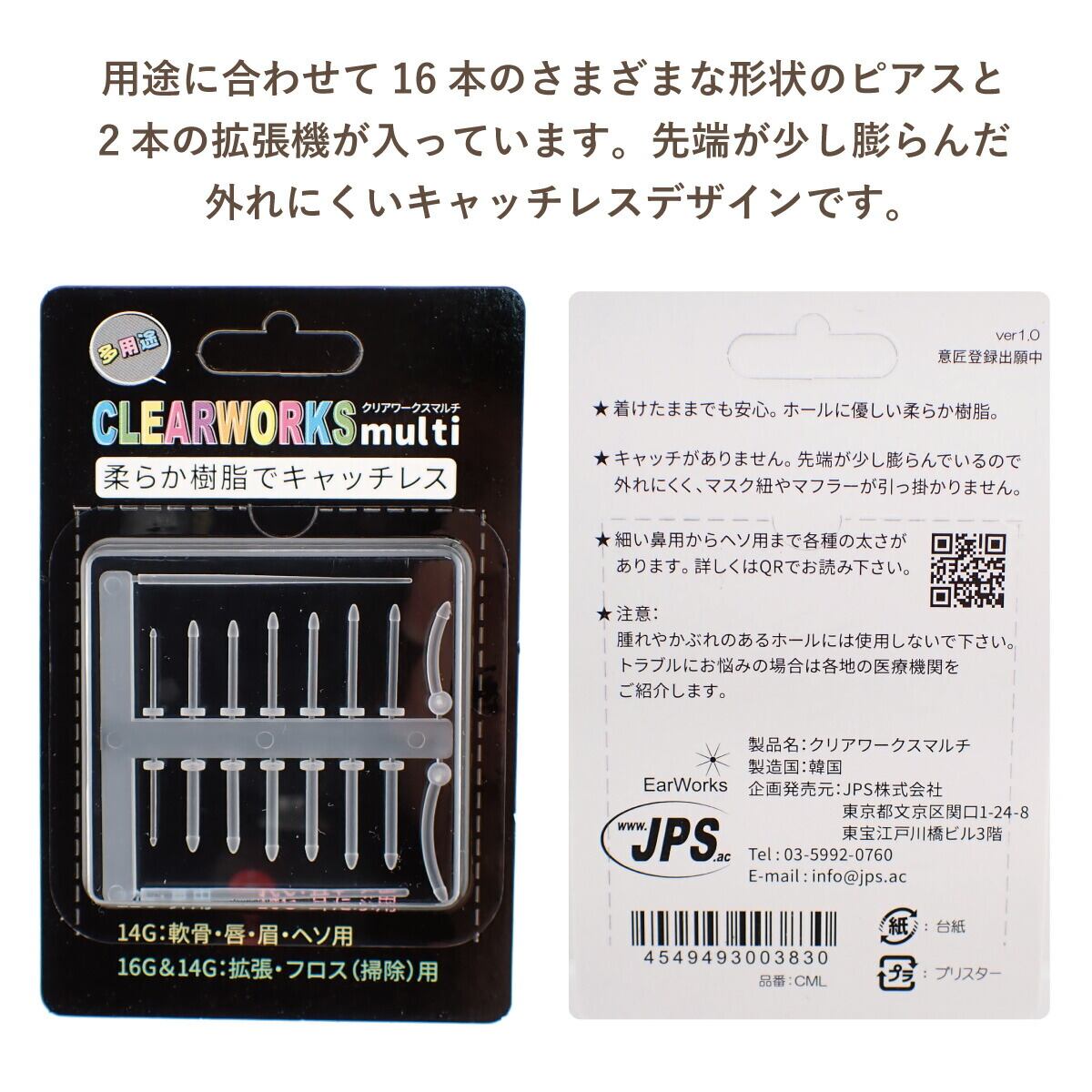 ボディピアス セット クリアワークスマルチ 医療用ポリプロピレン製 透明 クリア 目立ちにくい 22G 16G 14G 耳 軟骨 鼻 口 ヘソ 拡張 フロス お肌に優しい 金属アレルギー対応 金アレ シークレットピアス 透ピ 職場や学校に 安心 安全 シンプル JPS