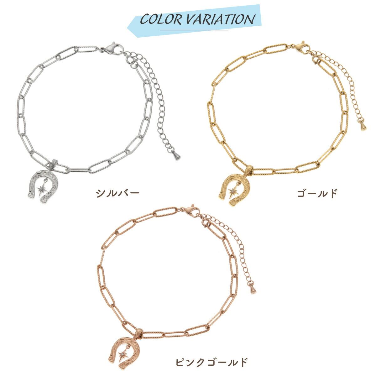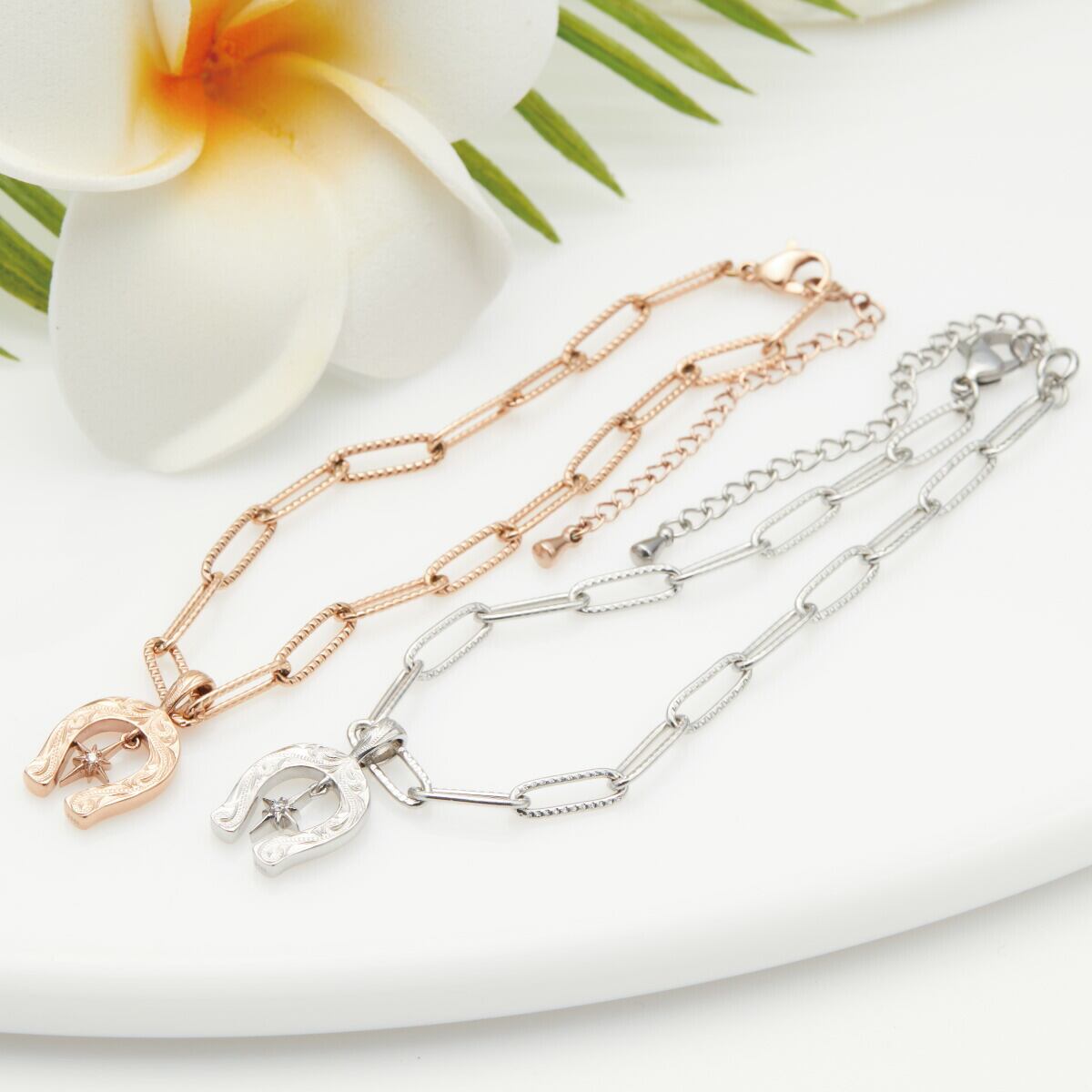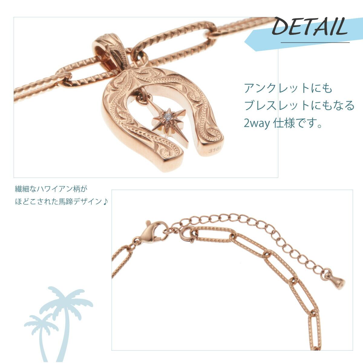 アンクレット ブレスレット レディース サージカルステンレス製 ハワイアンジュエリー ハワジュ 馬蹄 ホースシュー 一粒 一石 チェーン 2way 波 スクロール お肌に優しい 金属アレルギー対応 金アレ 上品 かわいい 誕生日 記念日 プレゼント ギフト 送料無料