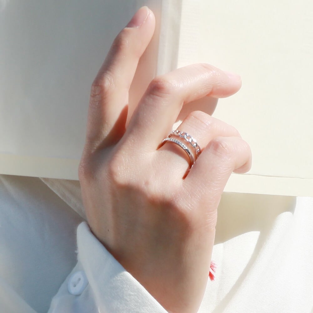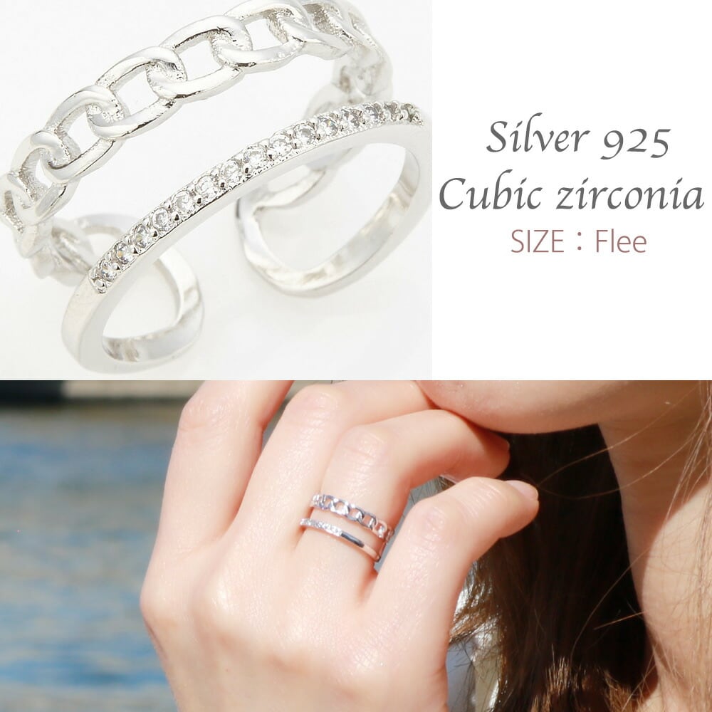 リング レディース キュービックジルコニア CZ シルバー925製 銀製品 2連デザイン ハーフエタニティ チェーン 重ね付け風 メタル 太め かわいい おしゃれ 上品 モード サイズ調節可能 メール便 送料無料 プレゼント 春夏秋冬 大人気