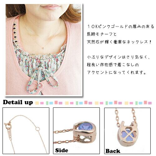 10Kピンクゴールドの厚みのある馬蹄モチーフと天然石タンザナイトが輝く豪華なネックレス