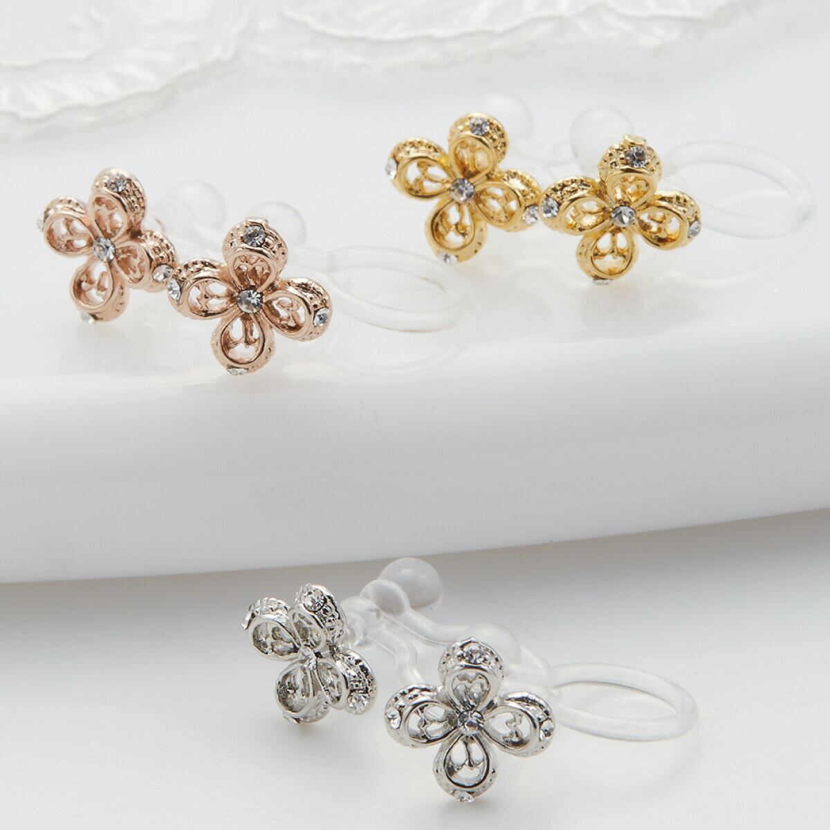 イヤリング ノンホールピアス レディース 日本製 樹脂製オメガパーツ フラワー 花 キラキラ シンプル 小さめ ミニ お肌に優しい 金属アレルギー対応 金アレ かわいい 大人可愛い オシャレ パーティー プレゼント ギフト 誕生日 記念日 メール便送料無料