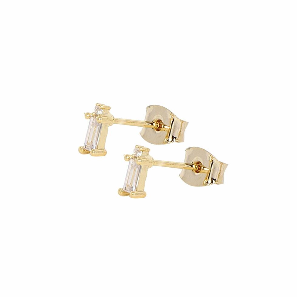 長方形のストーンの上に小さな1石のラインストーンがセットされた上品なスタッドピアス。