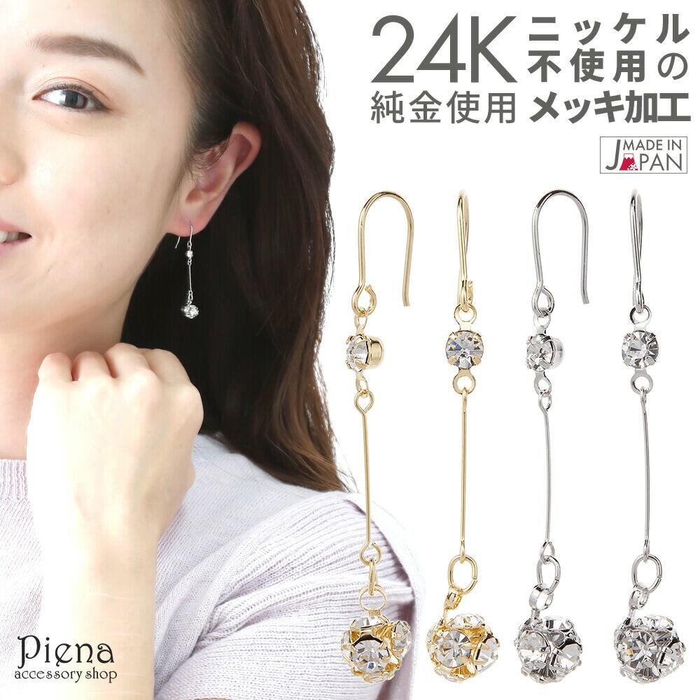 ピアス レディース フック パヴェボール ニッケルフリーポスト 24金 24K 6mm 6ミリ ラインストーン フリンジ 揺れる ジプシー プラチナ シンプル 日本製 金属アレルギー対応 ノーニッケル ニッケルフリー かわいい シルバー ゴールド メール便 送料無料 秋冬 大人気 あす楽