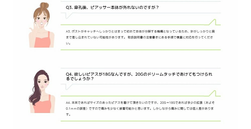 穿孔動作1回で、衣服や髪の毛への引っかかり防止を目的としたシリコンキャップが キャッチの上から装着されています。