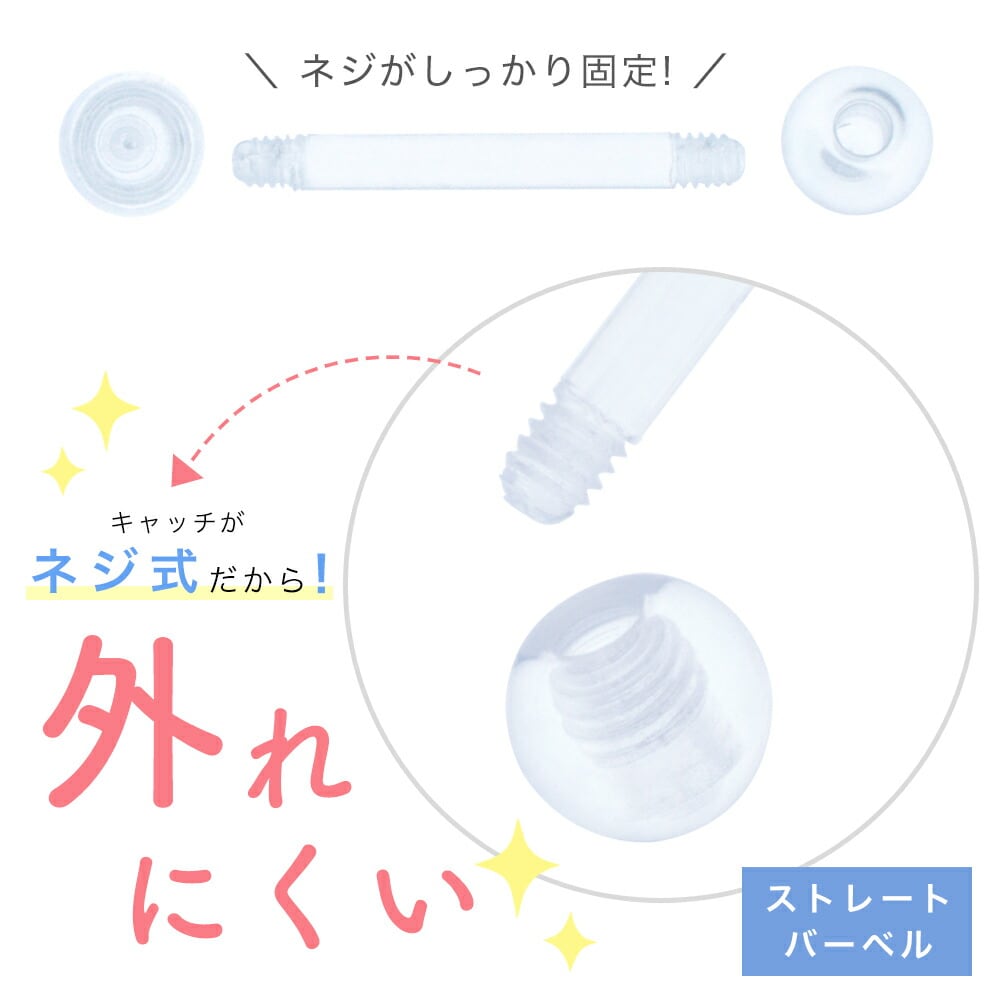 人体に優しいプラスチック素材・バイオプラストのストレートバーベルピアス。金属アレルギーになりにくくお肌に優しいバイオプラスト素材は医療器具にも採用されています。寒さや暑さにも強く超軽量で着け心地がよく毎日使いにおすすめ。マットで落ち着いた透明感のため目立ちたくないシーンでも活躍してくれます。