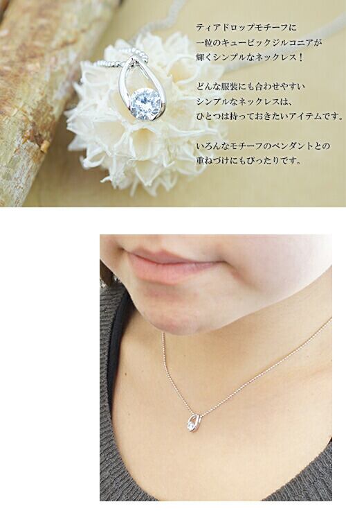 ティアドロップモチーフに一粒のキュービックジルコニアが輝くシンプルなネックレス