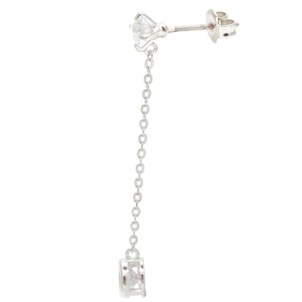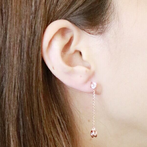 直径4mmのキュービックジルコニアのスタッドピアスから、まるいモチーフにもうひとつ石を入れて、チェーンでぶら下げたキュートなピアスです。