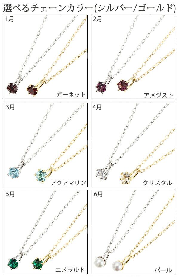 1月ガーネット、2月アメジスト、3月アクアマリン、4月クリスタル、5月エメラルド、6月パール、7月ルビー、8月ペリドット、9月サファイヤ、10月ローズ、11月トパーズ、12月タンザナイトから