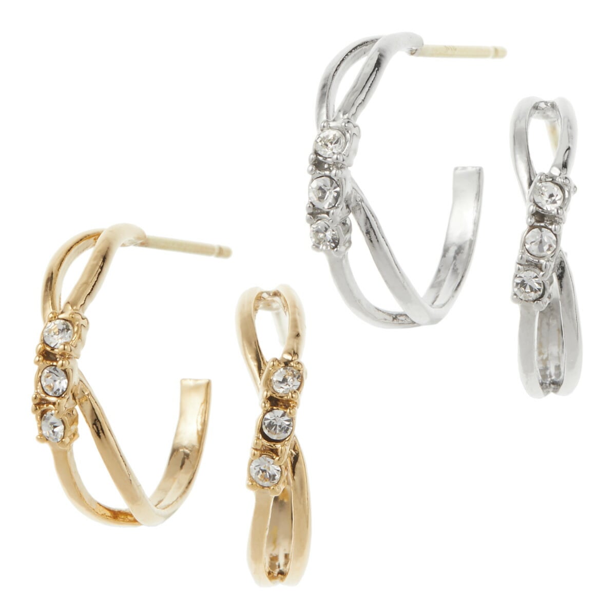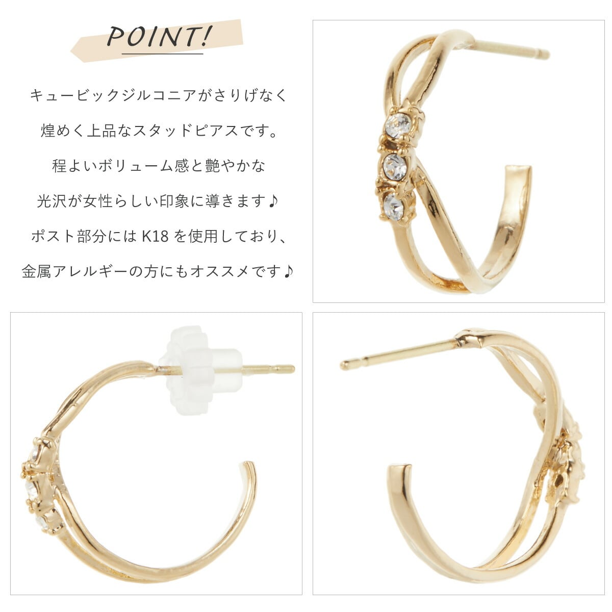 ピアス レディース K18ポスト 18金 K18ゴールド 日本製 キュービックジルコニア ハーフフープ 交差 キラキラ シンプル お肌に優しい 金属アレルギー対応 上品 かわいい 大人可愛い オフィス パーティー 結婚式 誕生日 記念日 プレゼント ギフト 送料無料