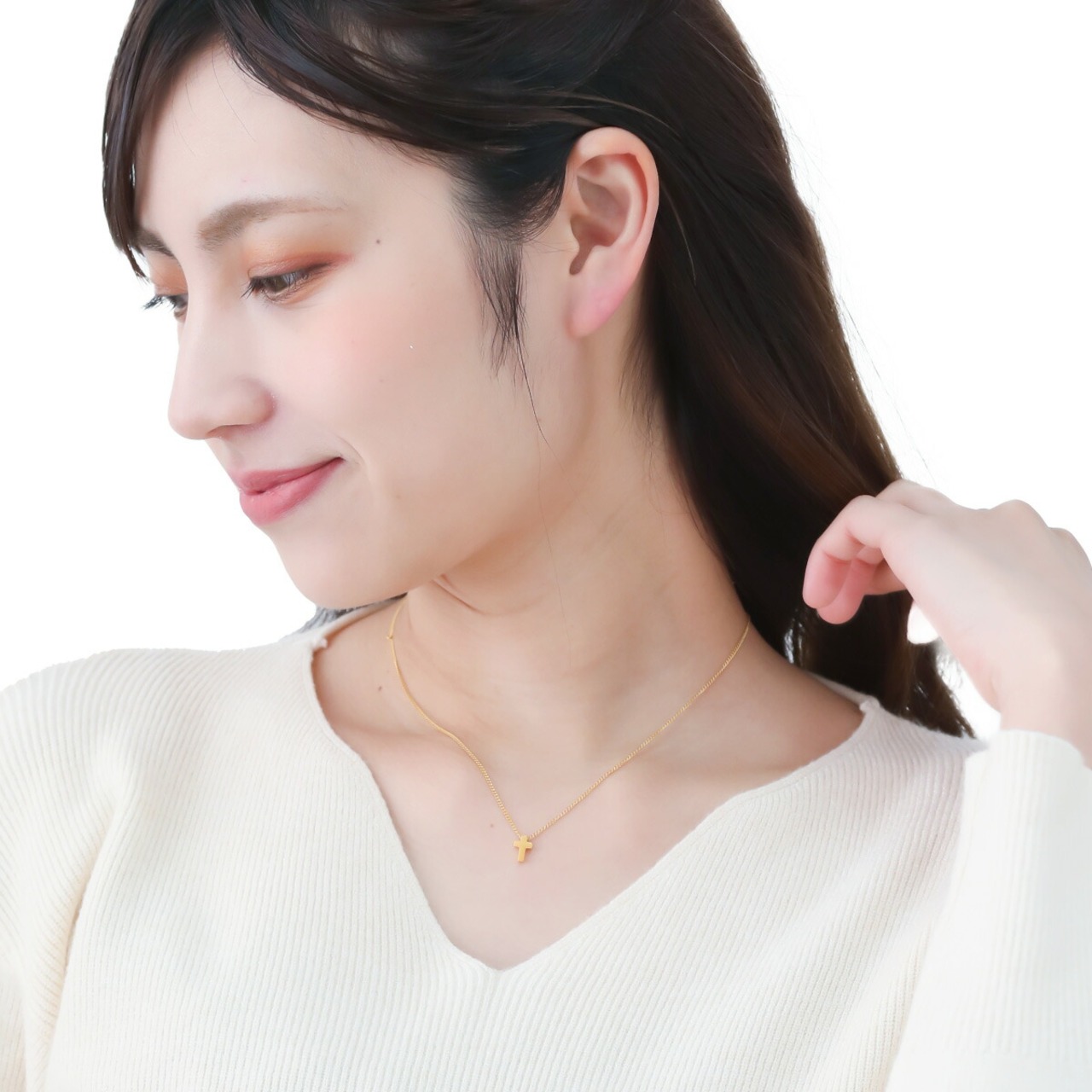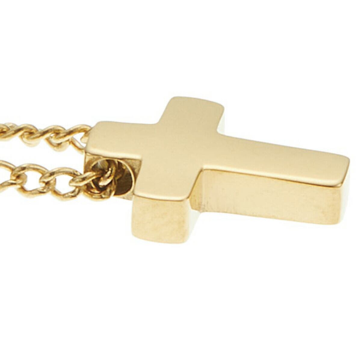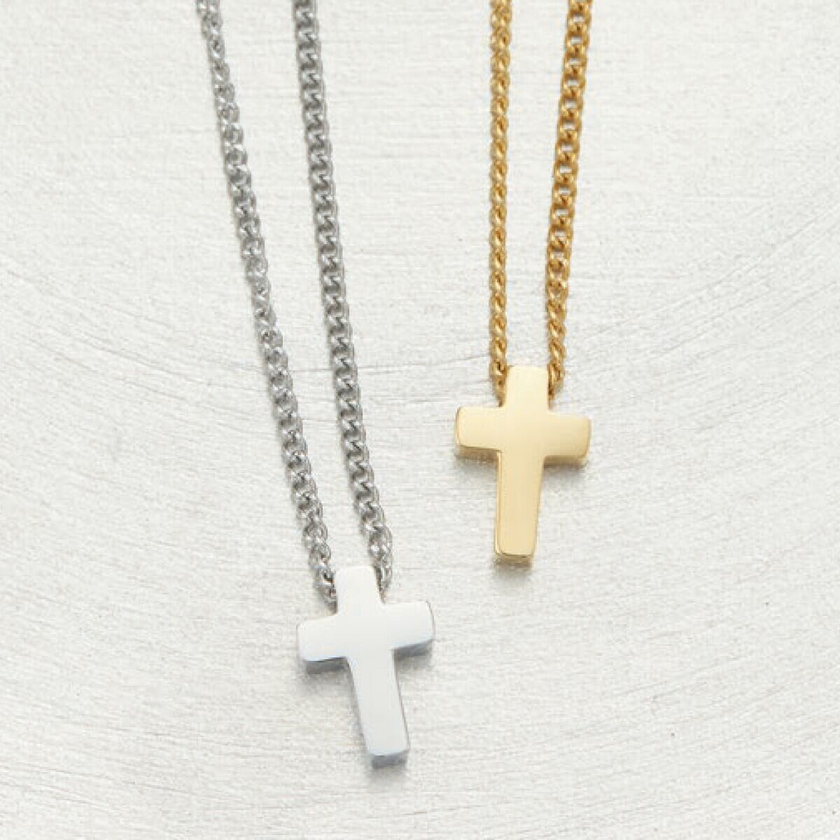 小さな十字架モチーフが揺れるネックレス。