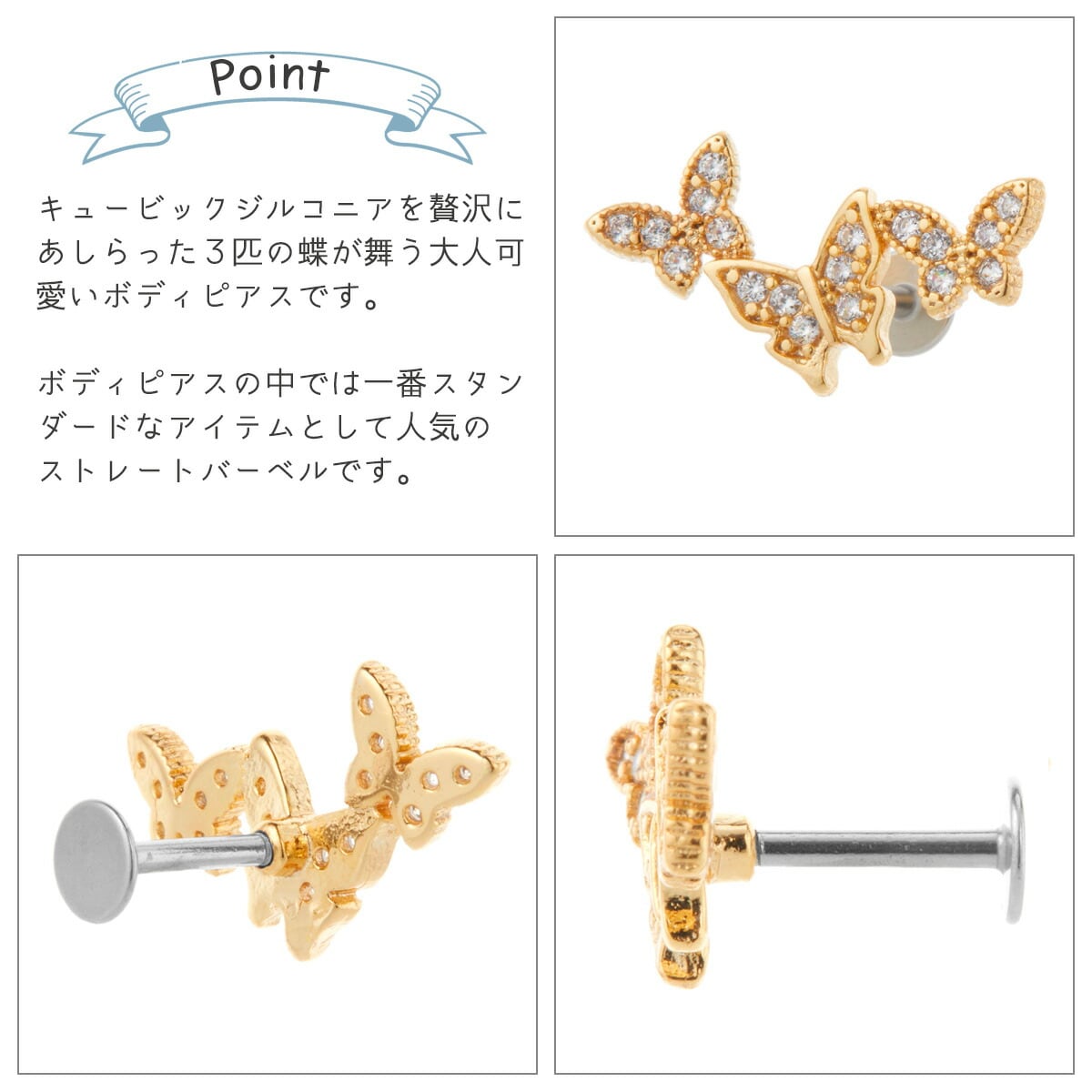 3匹の蝶が舞う大人可愛いボディピアスです。