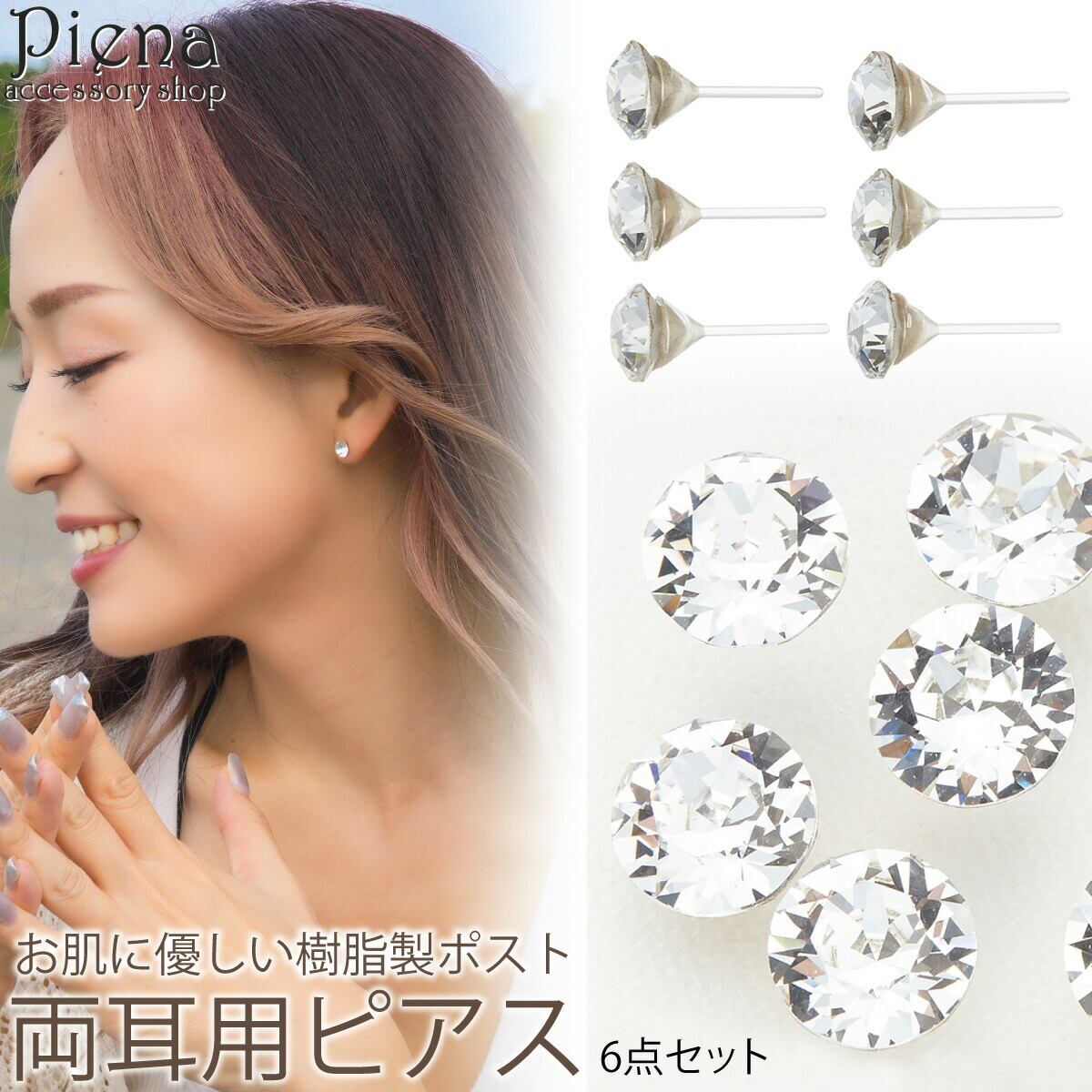 ピアス レディース 6ミリ大粒ラインストーンの6個セット 樹脂製スリムポスト 低金属アレルギー 日本製 クリアカラー シンプル 大人かわいいメンズ プレゼント用にも メール便 送料無料 春夏秋冬 大人気