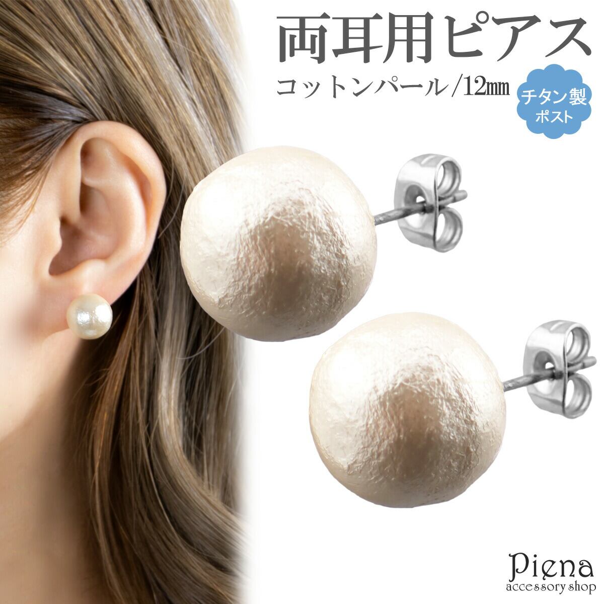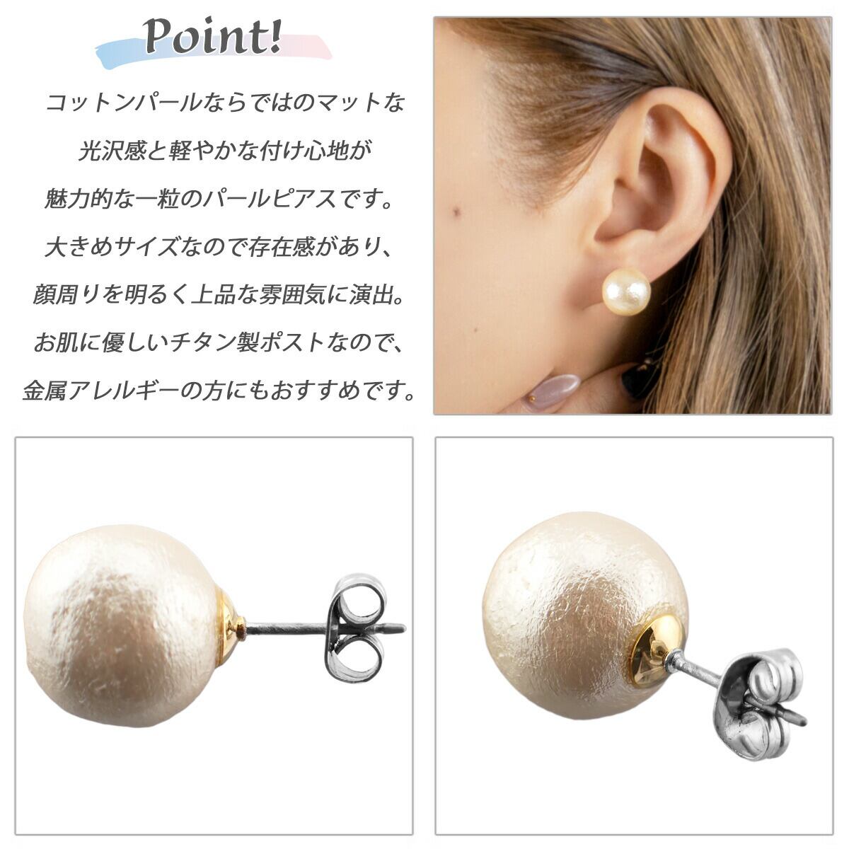 ピアス レディース チタン製ポスト 両耳用 一粒 コットンパール 12mm ドレスに合う お肌に優しい 金属アレルギー対応 金アレ シンプル 可愛い おしゃれ 上品 エレガント パーティー 誕生日 記念日 プレゼント メール便送料無料