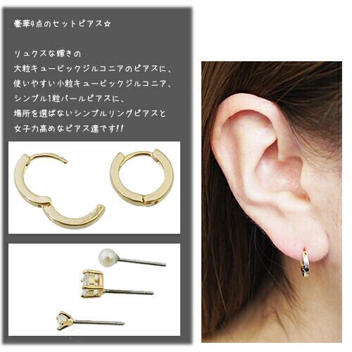 セットピアス レディース 大小キュービックジルコニア 1粒パール リングピアスの4点セット 複数のピアスホールのあるオシャレさん向け サージカルステンレス316L製ポスト シルバー ゴールド ピンクゴールド 日本製 メール便 送料無料 金属アレルギー対応 プレゼント 春夏秋冬