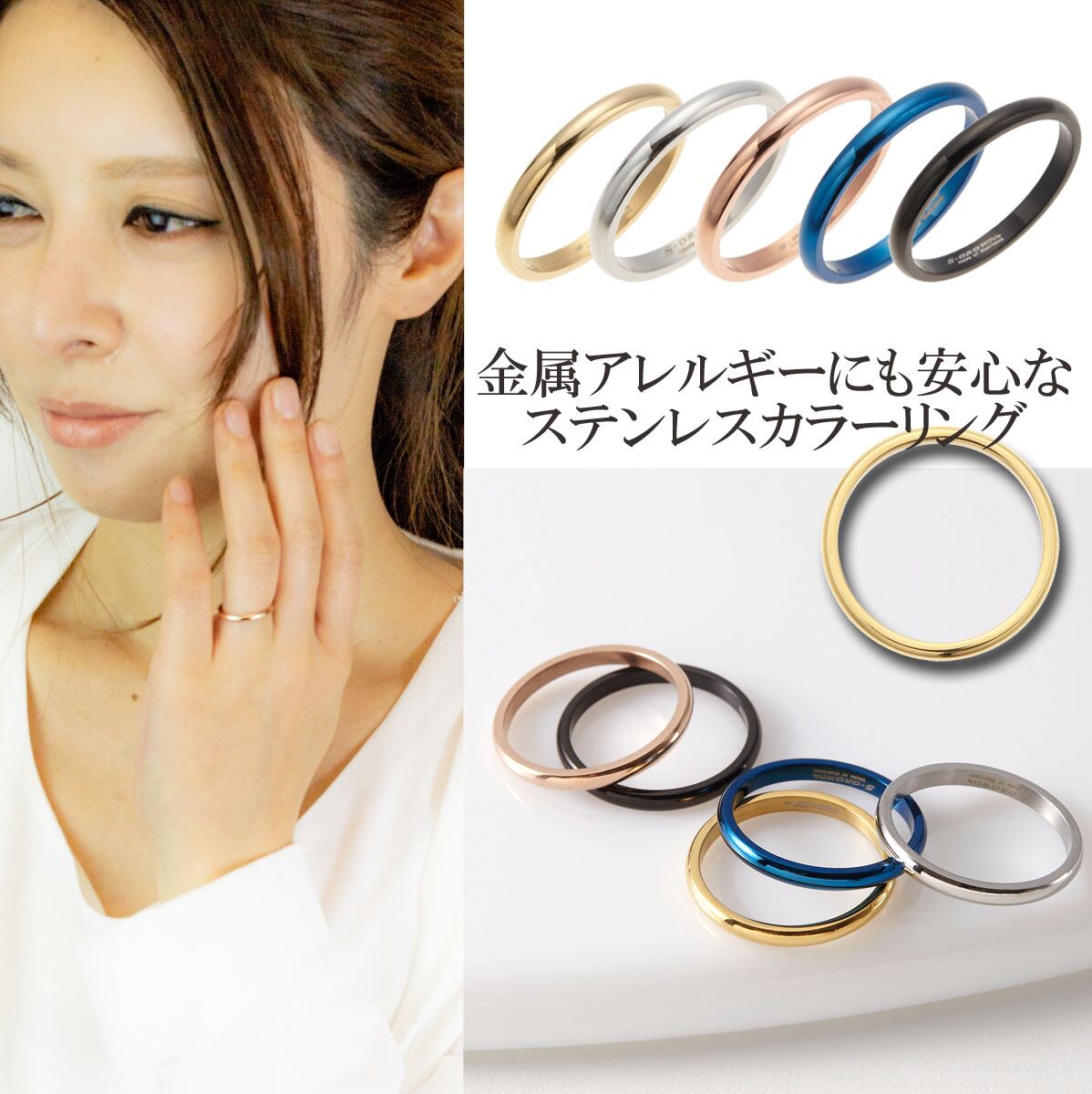 リング レディース 指輪 サージカル ステンレス シンプル シック 甲丸リング シルバー ゴールド ピンクゴールド ブルー ブラック 太さ2mm 2ミリ 細め 細い ツヤ有り 傷付きにくい S M 金属アレルギー 対応 安心 メール便 送料無料 春夏秋冬 大人気