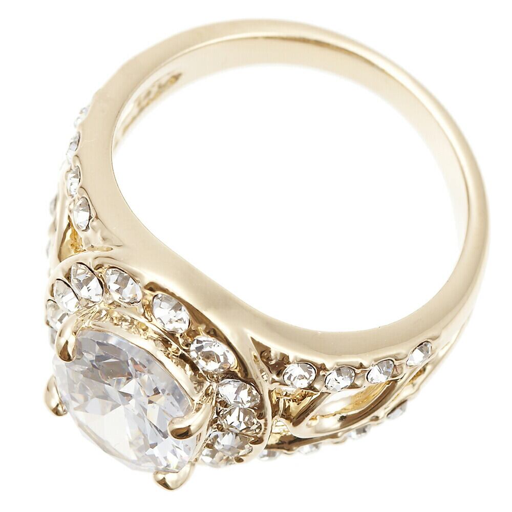 艶感の量感ゴールドベースのトップにオーバル形のクリアビジューの綺麗な透明感が輝く。