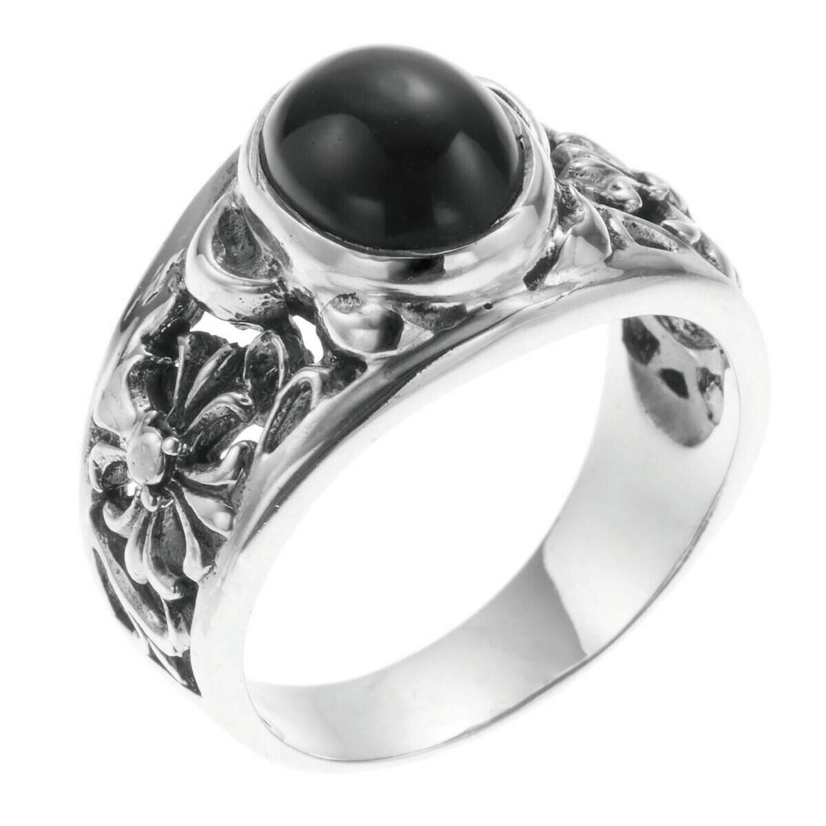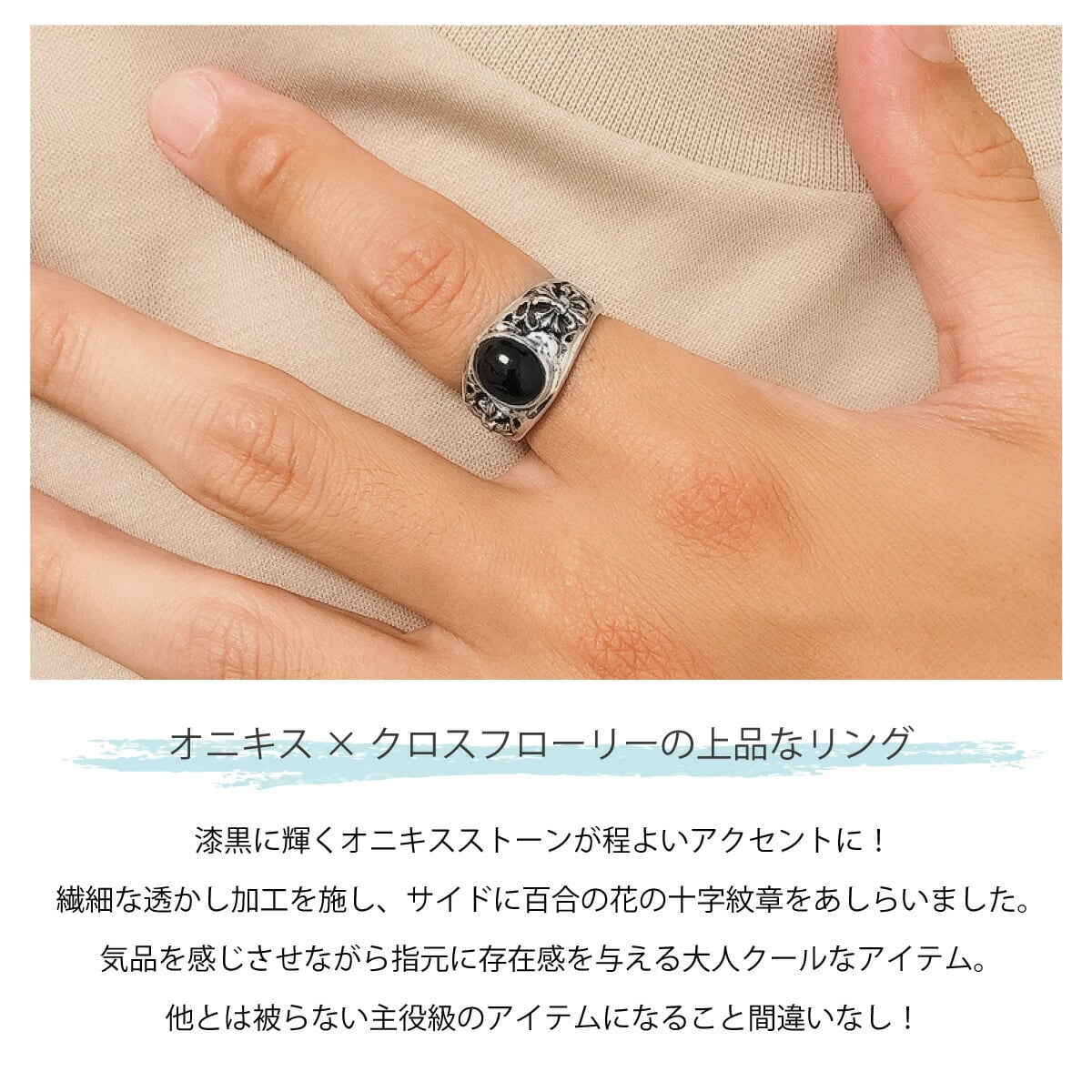 リング メンズ シルバー925 オニキス 百合の花の十字 紋章 クロスフローリー 十字架 幅広 ワイド 大ぶり ごつめ ユニーク お肌に優しい 金属アレルギー対応 オシャレ かっこいい 彼氏 旦那 恋人 誕生日 記念日 プレゼント ギフト 送料無料