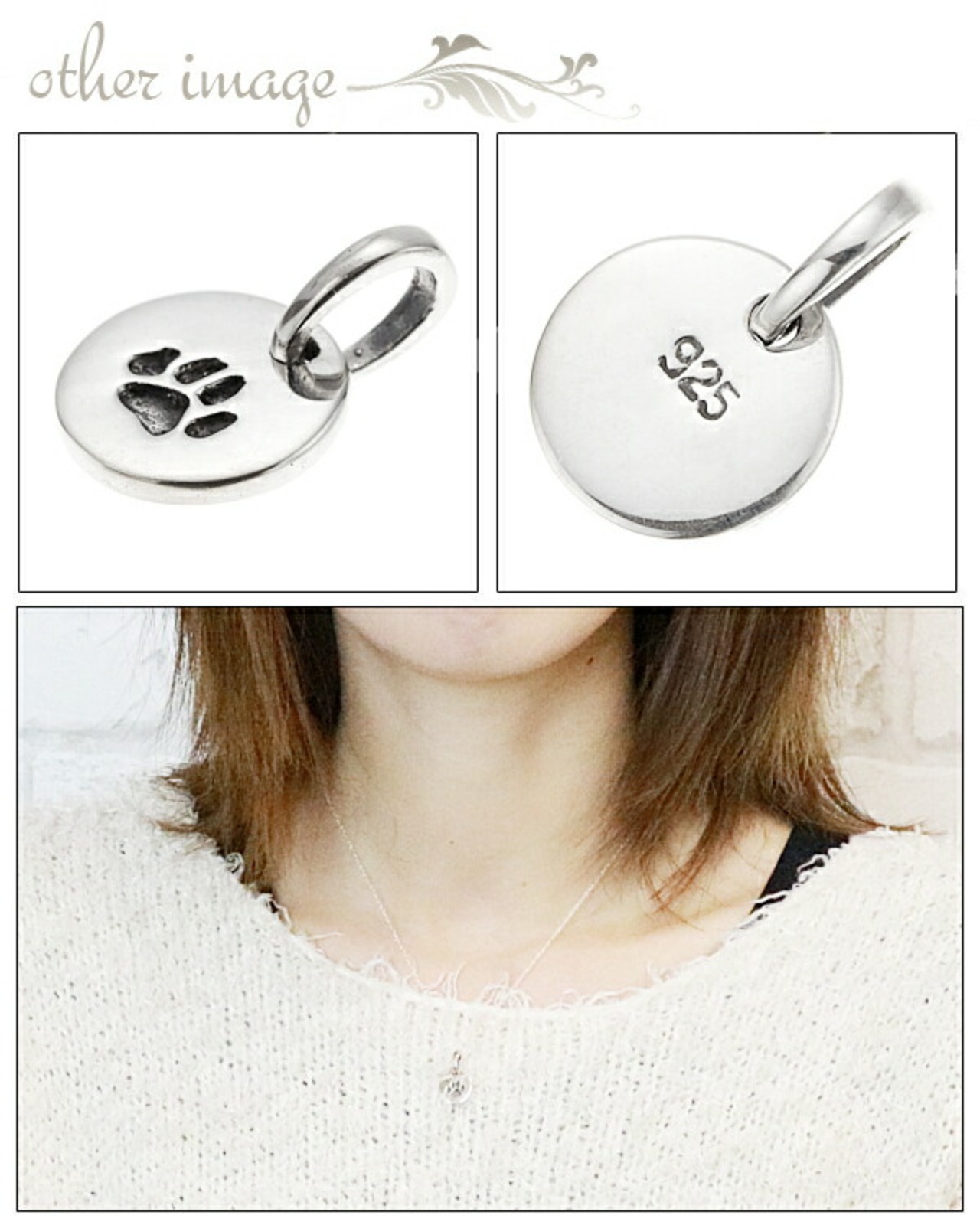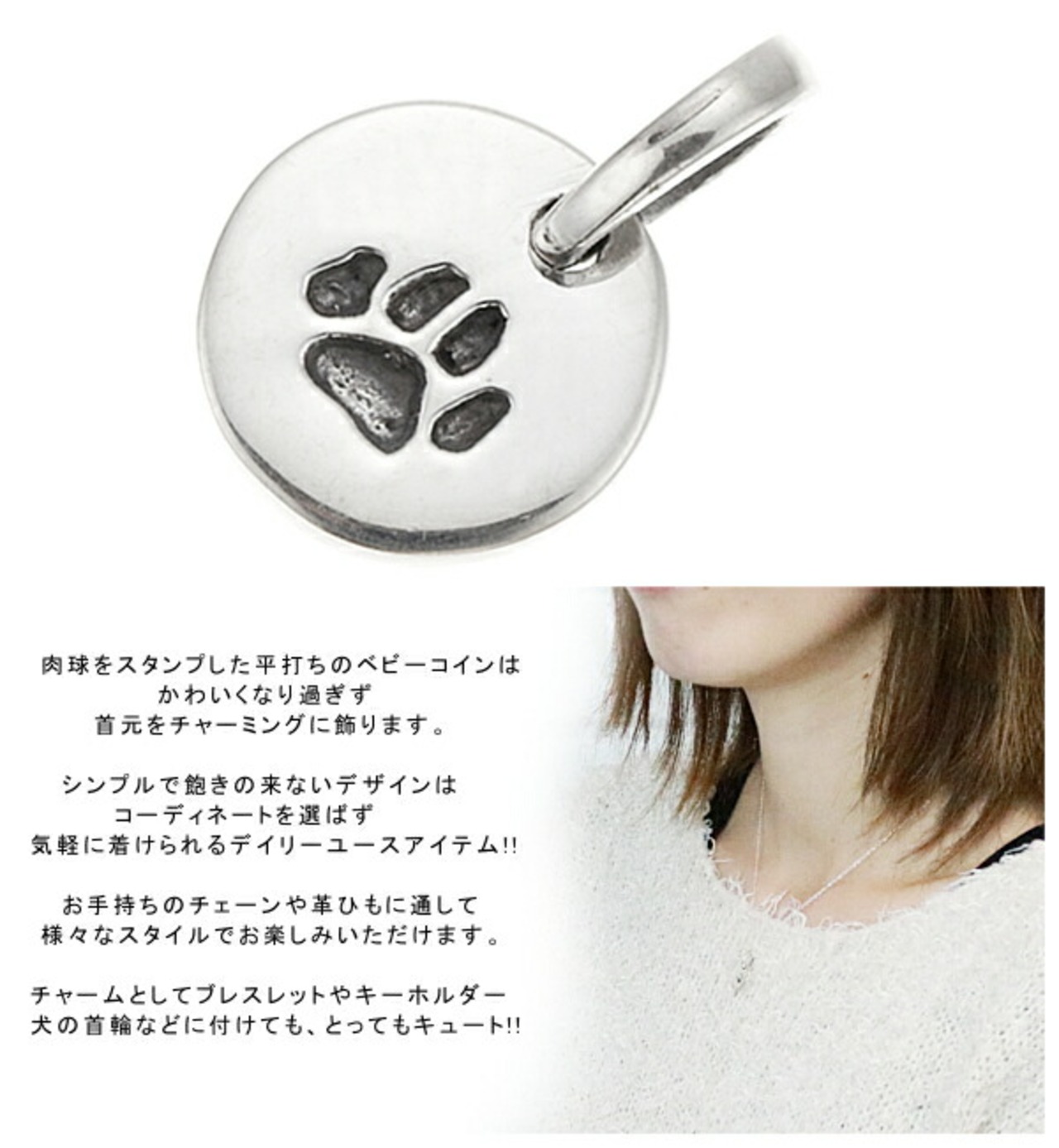 肉球をスタンプした平打ちのベビーコインは、かわいくなり過ぎず、首元をチャーミングに飾ります。