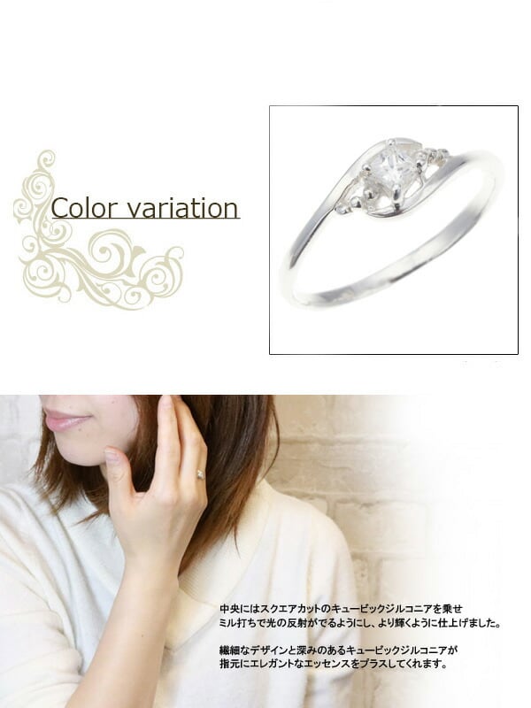 中央にはスクエアカットのキュービックジルコニアを乗せ