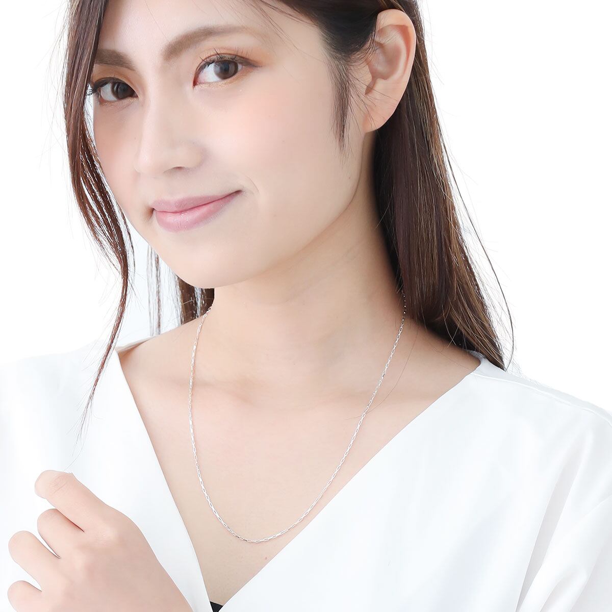 首元にアクセントを与える長あずきチェーンのネックレス。