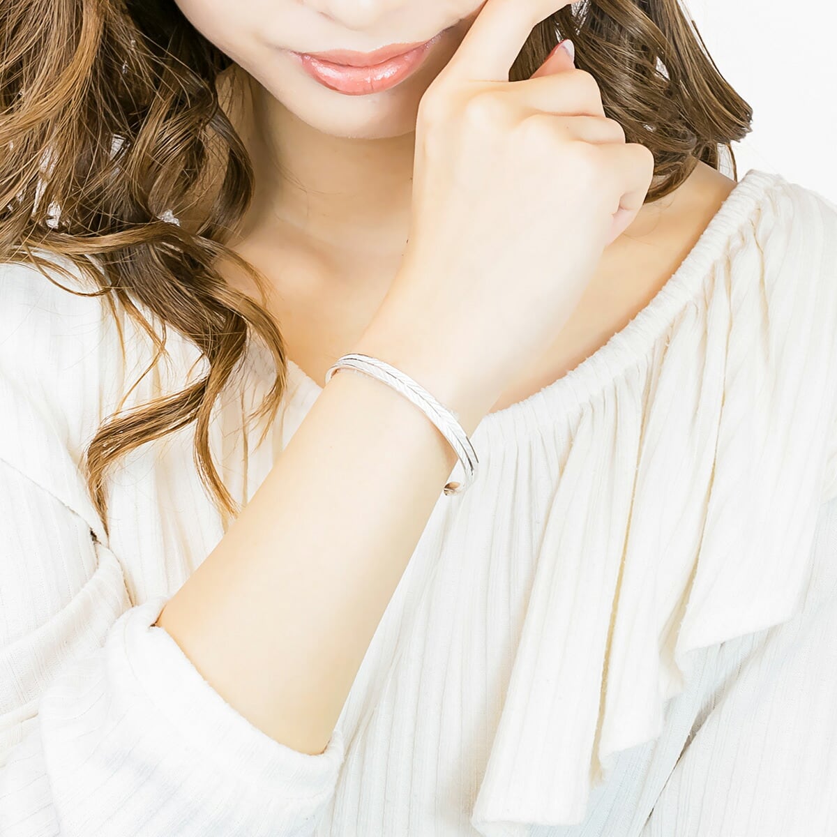 適度な太さのタイプなので時計やチェーンブレスレットなどと重ね付けでもお使いいただけます。