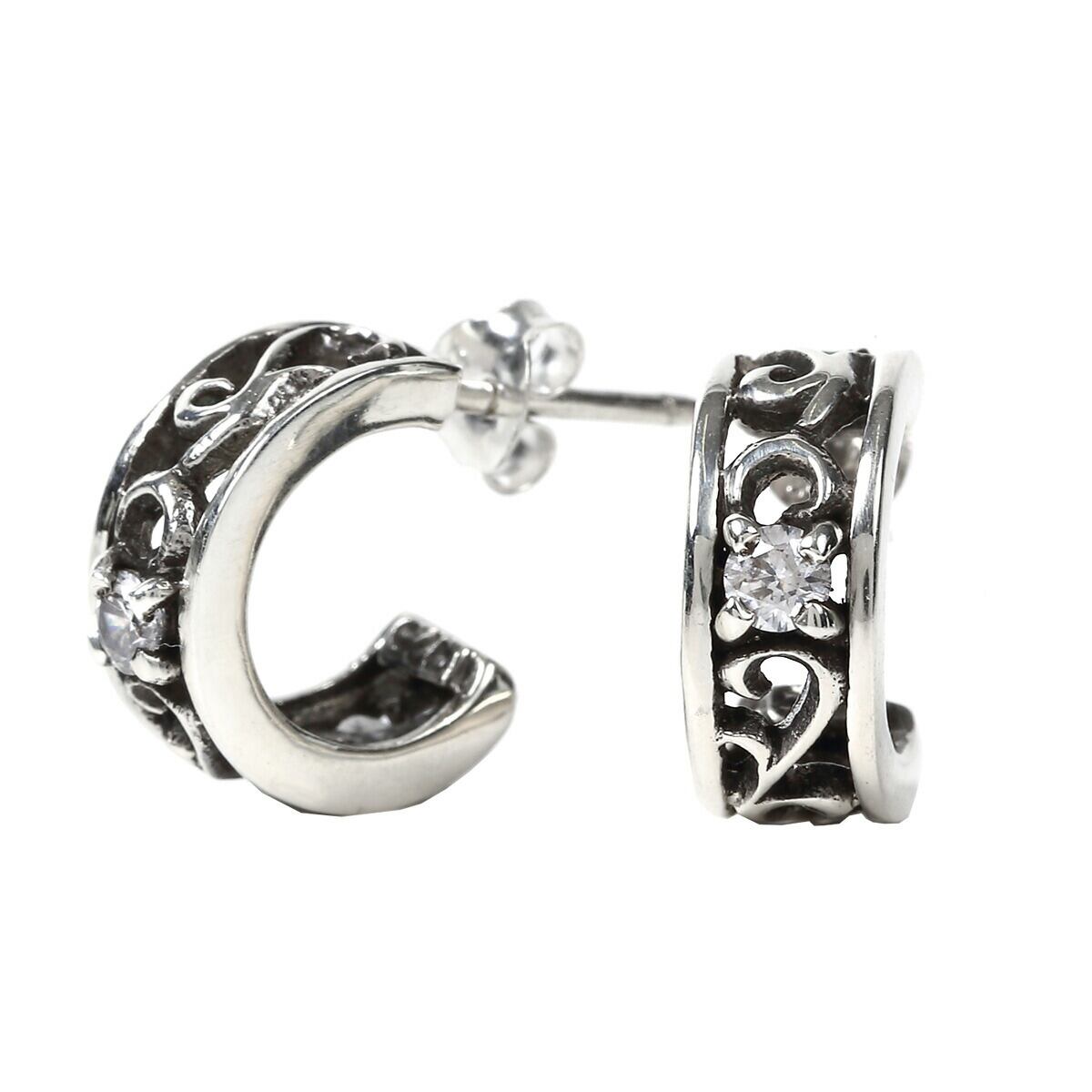 ピアス メンズ レディース アラベスク ハーフフープ キュービックジルコニア シルバー925 シルバー925キャッチ 燻し加工 透かし彫り 1粒 1石 一粒 一石 デイリー 日常使い 小さめ 大人かわいい カッコいい クール シルバー プレゼント ギフト メール便 送料無料 秋冬 大人気