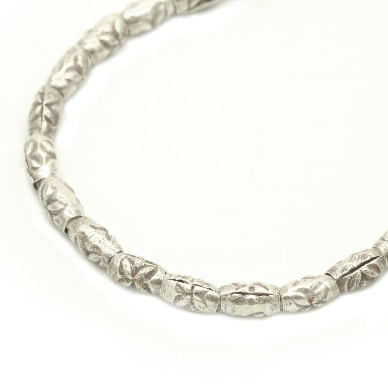 楕円型の筒状ビーズにお花のような刻印がほどこされています。