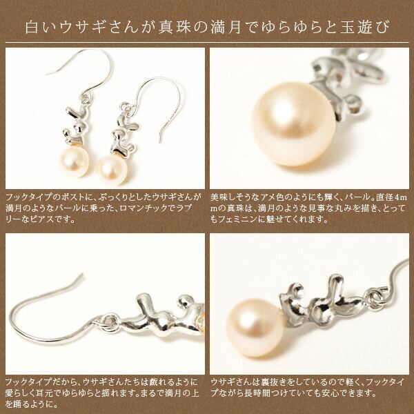 白い兎さんが真珠の満月の上でユラユラと玉遊びするお月見ピアス。