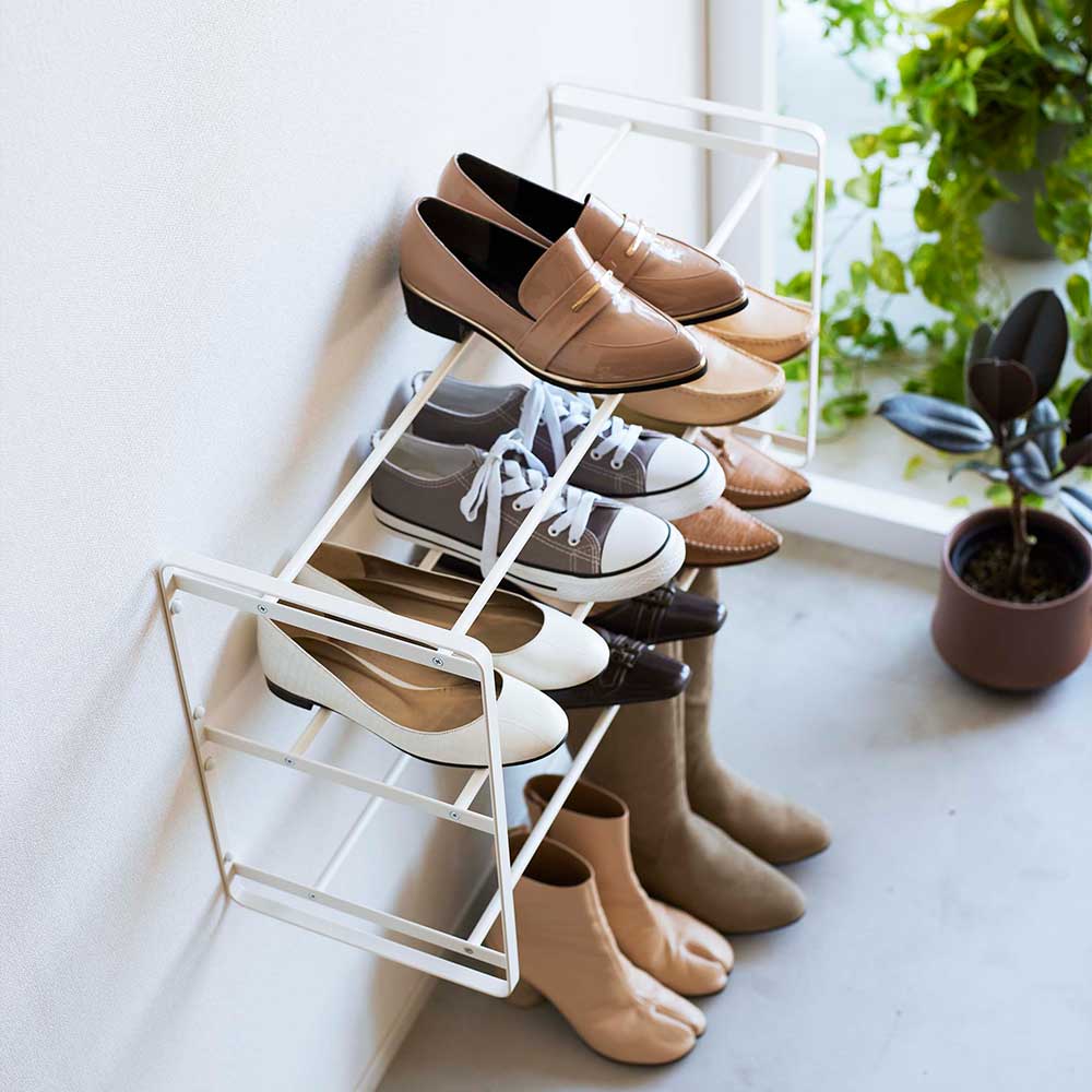 直径約1mm程の細い石こうボードピンで、壁にしっかり固定できるシューズラック。ロングブーツやショートブーツ、長靴など靴の高さに合わせ取り付け可能です。