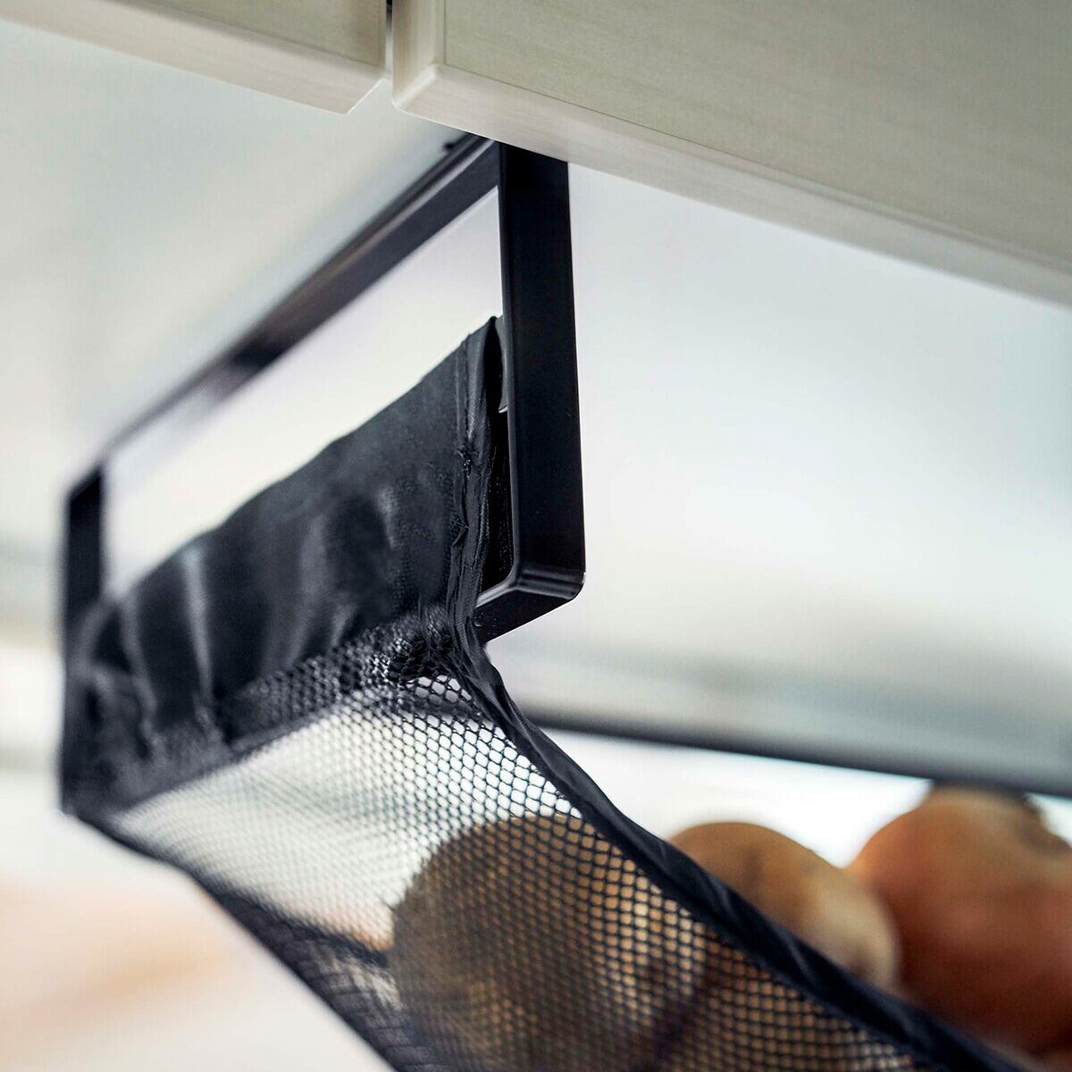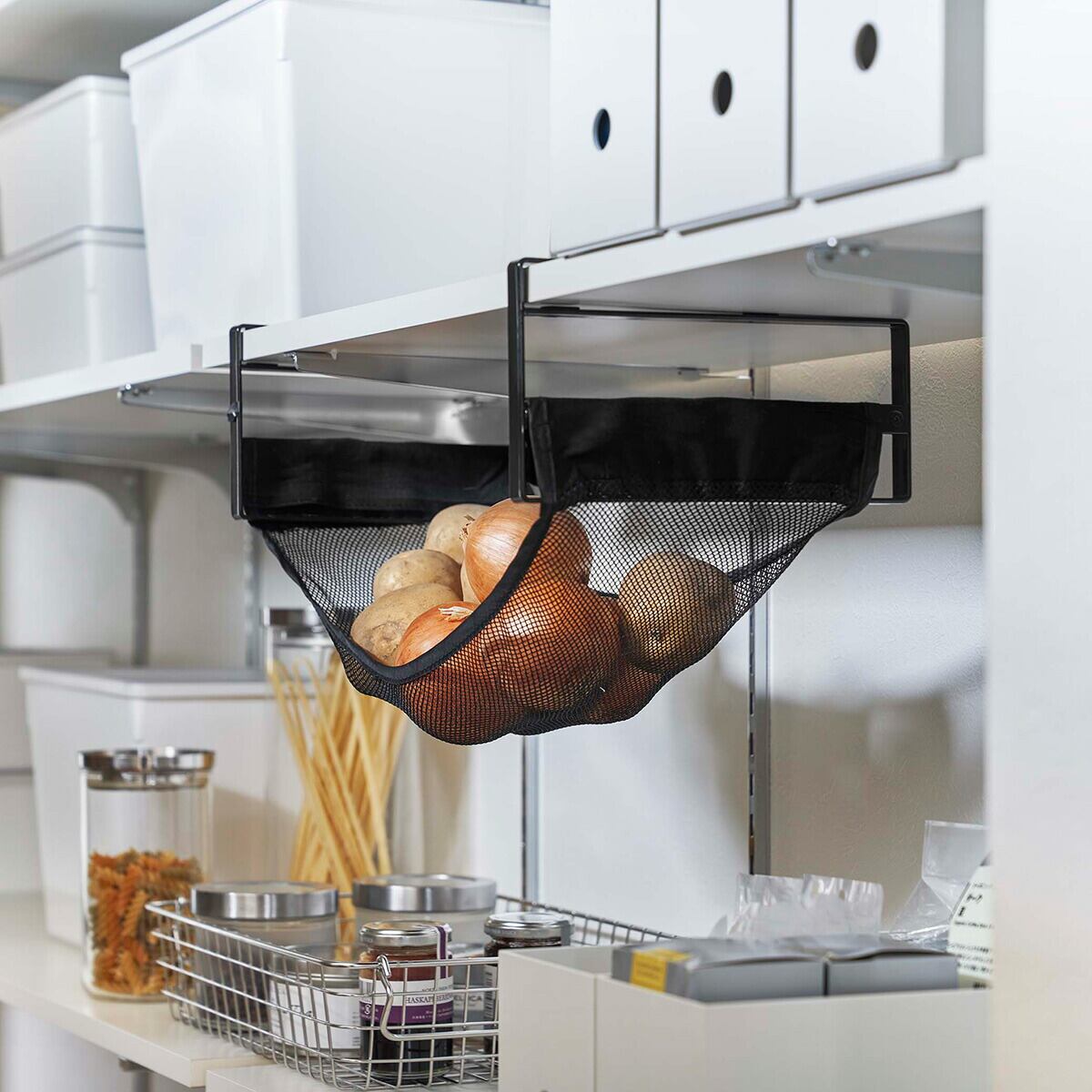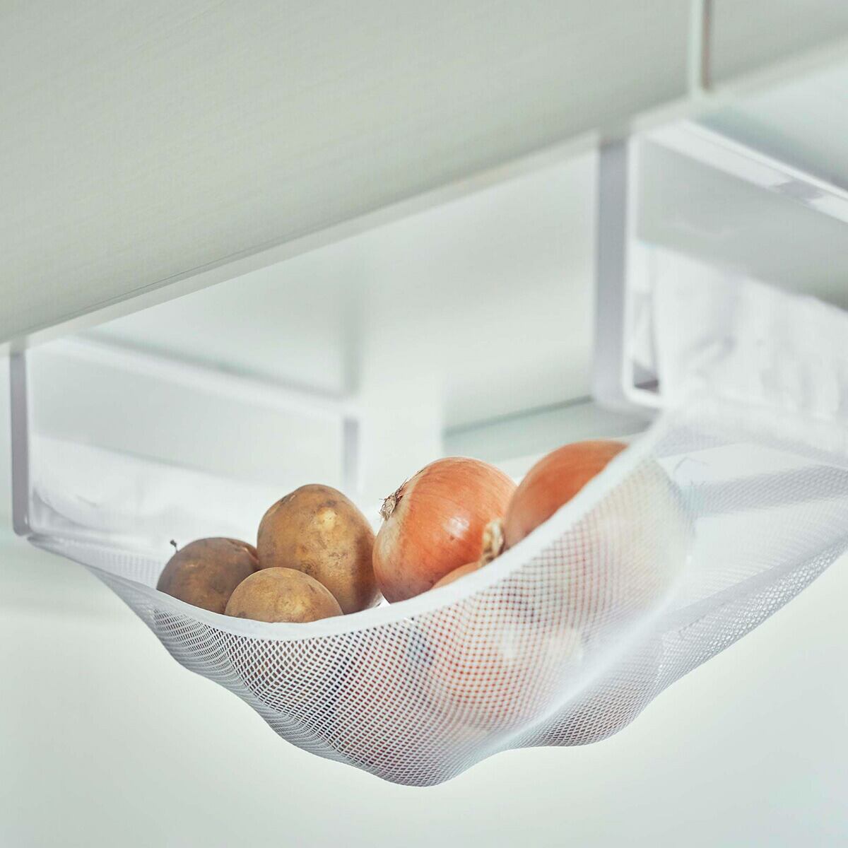 常温保存の野菜や果物を通気性の良いネットに収納できる、取り出しやすくスタイリッシュな棚下野菜収納ネットです。棚下に設置できるのでデッドスペースを有効活用できます。料理に必要な食材の一時置きなどにも。パントリーなどの棚下の空間を収納スペースに。野菜や果物を常温保存する場合は風通しの良い状態で保存しておくと長持ちします。