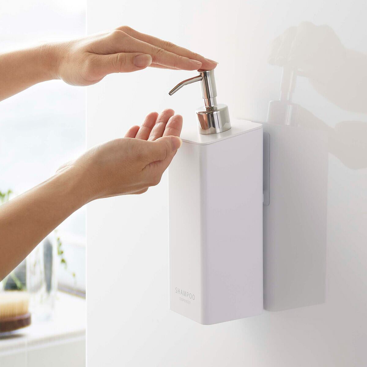 フィルムフックで取り付けるタイプのディスペンサーです。浴室壁面に設置したままポンプを押して液体を出すことができます。ポンプ部が斜めになっていることで押す力が分散され、ずれにくく快適にお使いいただけます。